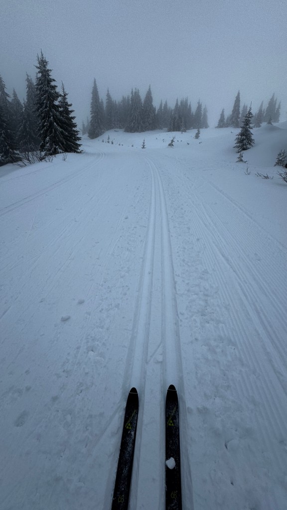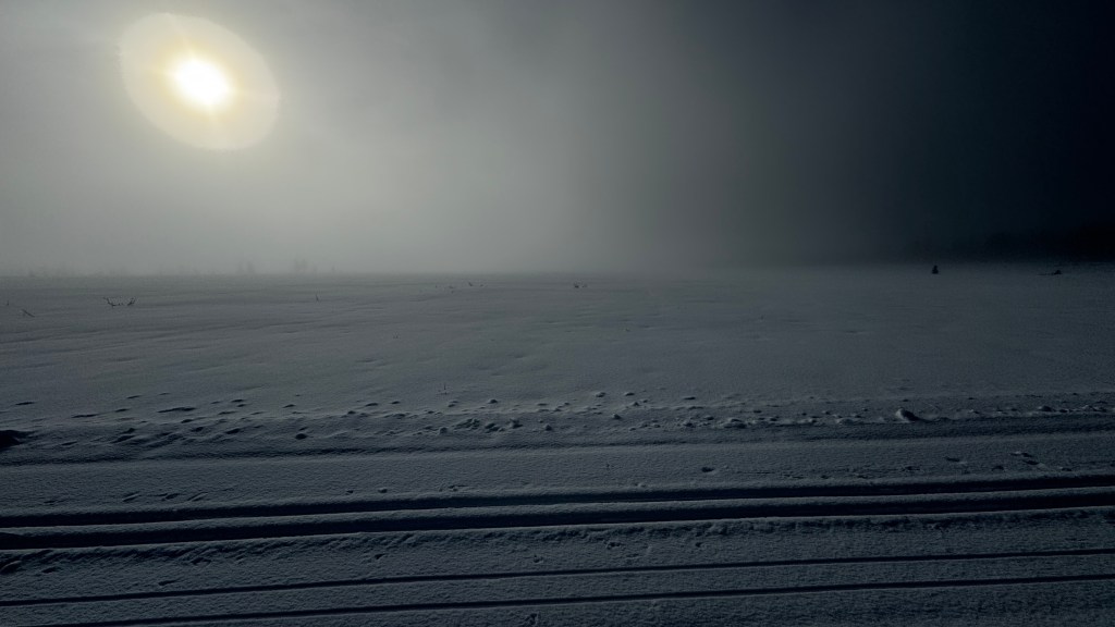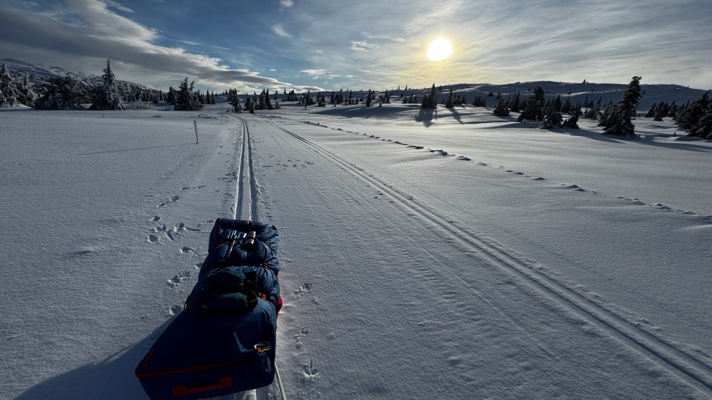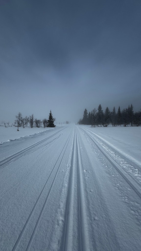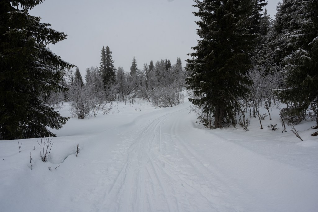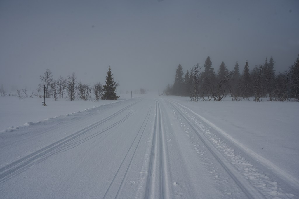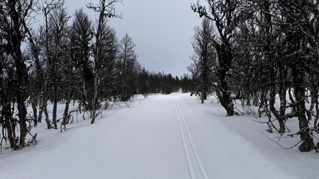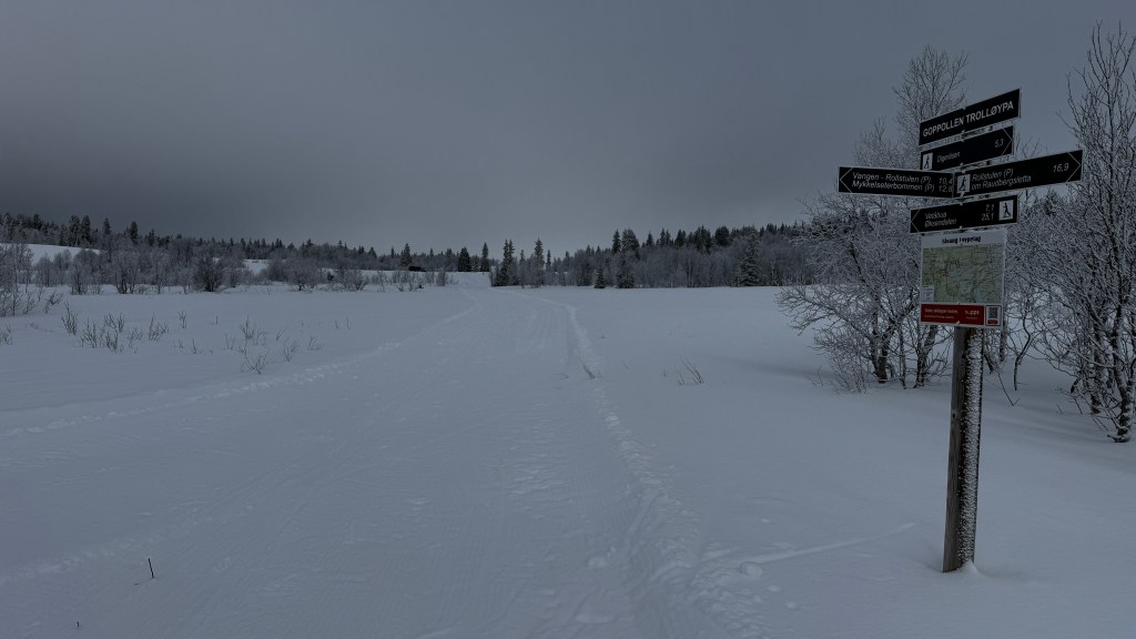 Es geht nun um den Gopollen herum und durch die gleichnamigen Ferienhaussiedlungen Midt und Nord Gopollen. Dann geht es langsam abwärts hinunter zur Gopollmyrene und in einer langen Linkskurve durch das Moor. Die Ski habe ich bereits inmitten der Siedlung abgeschnallt. Die Kurzfelle waren extrem am Stollen. Zu allem Überfluss scheine ich mir am Vortag eine ordentliche Blase zugezogen zu haben. Die hatte ich zwar heute Morgen mit Compeed abgeklebt, aber das scheint nicht geholfen zu haben. Bis zur nächsten Hütte, der Vetåbua, sind es keine 3 km mehr, und ich folge der Loipe langsam. Endlich kommt auch die Sonne raus und dieser graue Dunst verzieht sich.