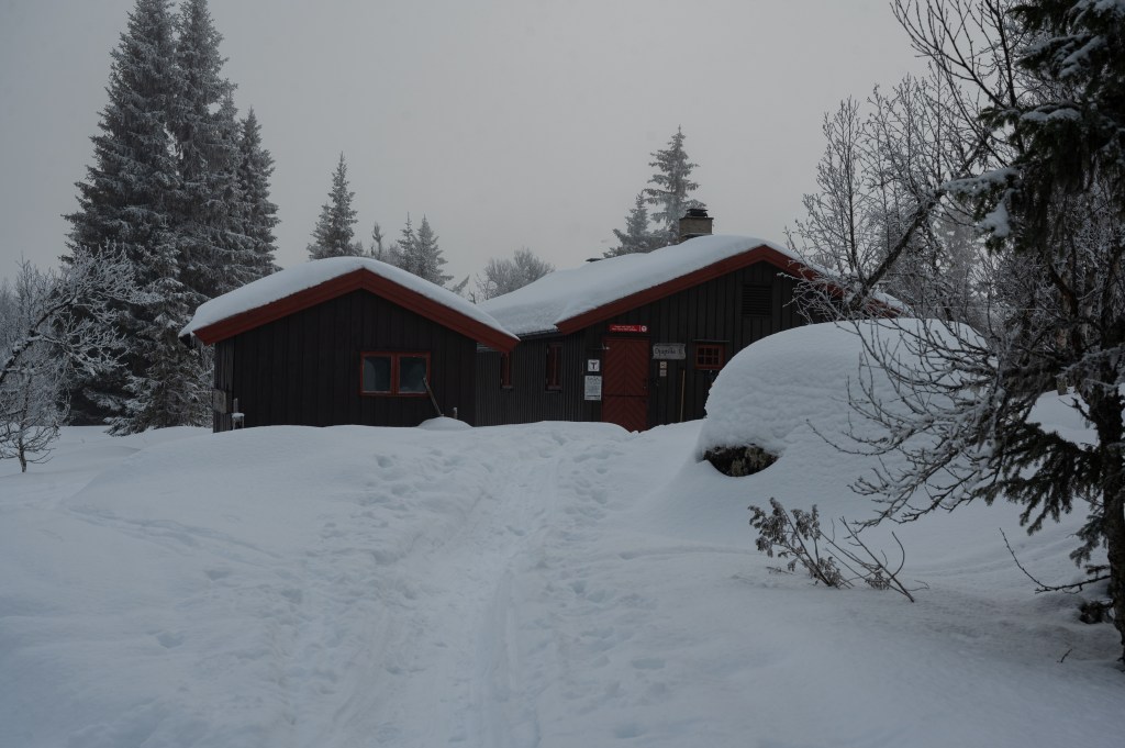 Gut 20 Minuten später stehe ich an der Weggabelung zur DNT-Hütte. Ich folge dem schmalen Pfad durch die Hüttenansammlung hindurch zur Haupthütte. Die Hütte scheint mir komplett allein zu gehören. So heize ich erst einmal den Ofen ein, hole ordentlich Brennholz aus dem Lager und fülle das Wasser auf. Dann gibt es eine Tasse heiße Schokolade, mit der ich mich draußen auf die Bank setze und die fantastische Aussicht zum Gopollen hinüber genieße.