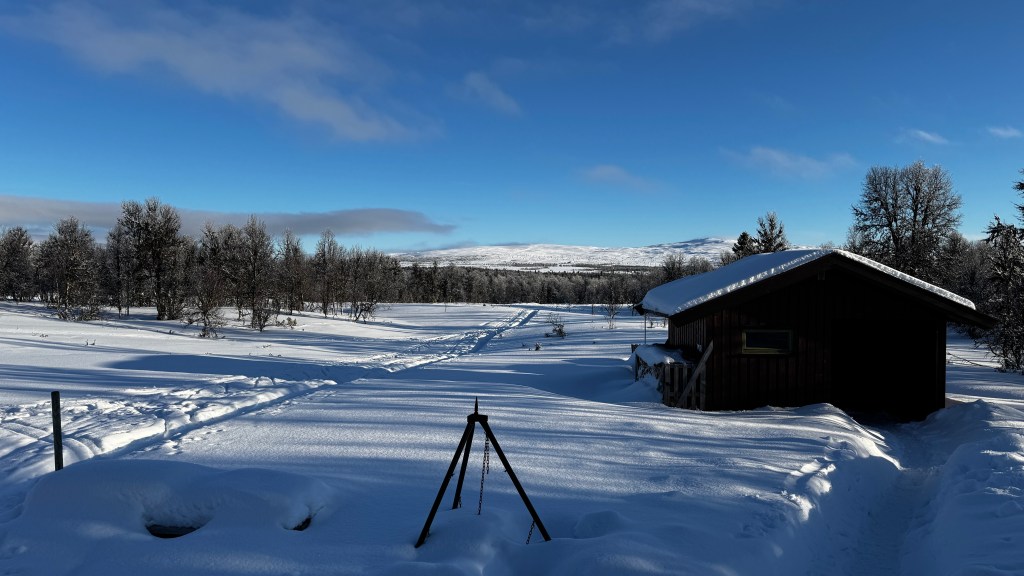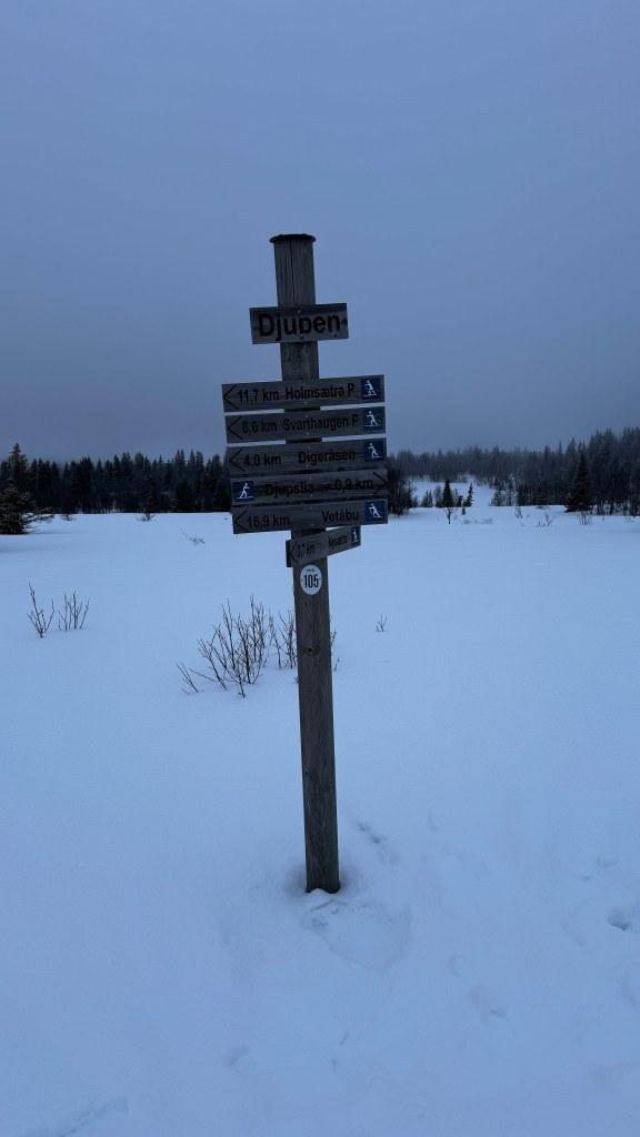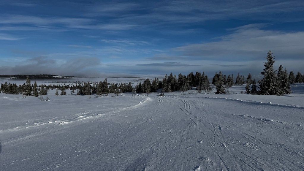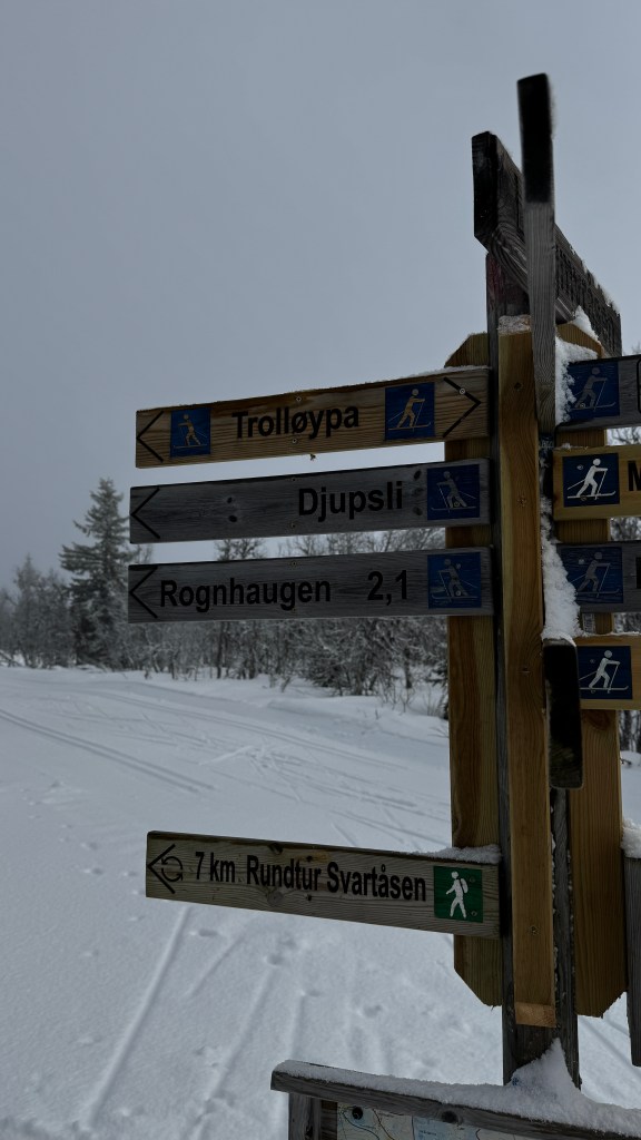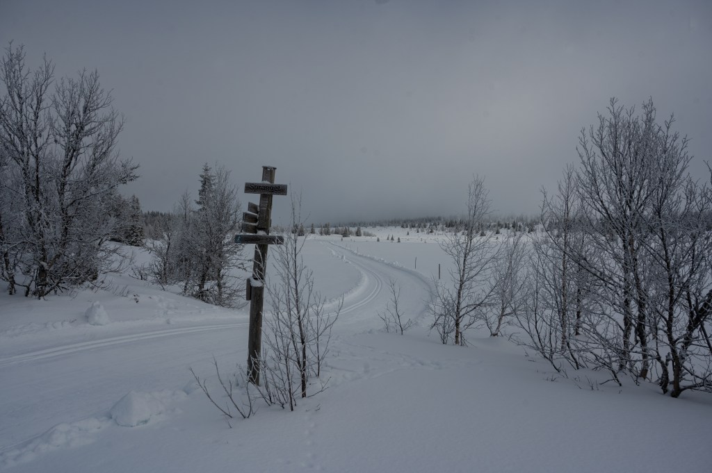 Ich setze mich wieder in Bewegung und folge dem Abzweig nach Rognhaugen. Es geht direkt zwischen ein paar Ferienhäusern den Berg hoch. Das Gelände wird ein wenig hügeliger und verlangt mir die nächsten dreieinhalb Kilometer einiges ab. Dann kommt der letzte Hügel hoch nach Rognhaugen. Ich stehe hier oben am Wegweiser, pfeife gefühlt aus dem letzten Loch und mache eine wohlverdiente Pause. Kurz vor mir sind zwei Langläufer angekommen, die sich, soweit ich es verstehe, über den Weg unterhalten. Ich schlürfe meinen Tee und genieße die Aussicht über das umliegende Gelände. Was mir auffällt, ist, wie wenig Schnee hier in diesem Jahr liegt. Aber das Gefühl hatte ich schon die ganze Zeit unterwegs. Und so sitze ich hier, krame mein Smartphone raus und suche Fotos aus 2020 von dieser Stelle.