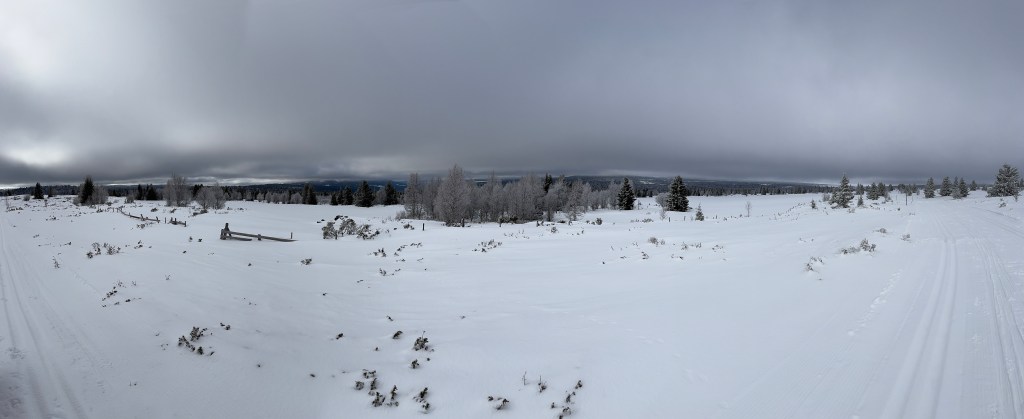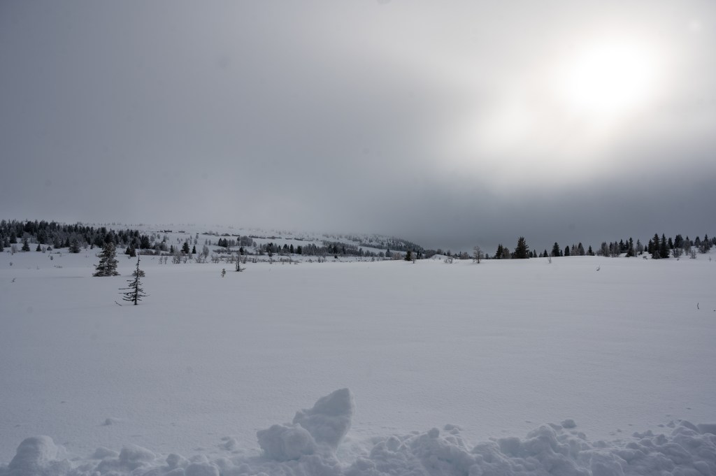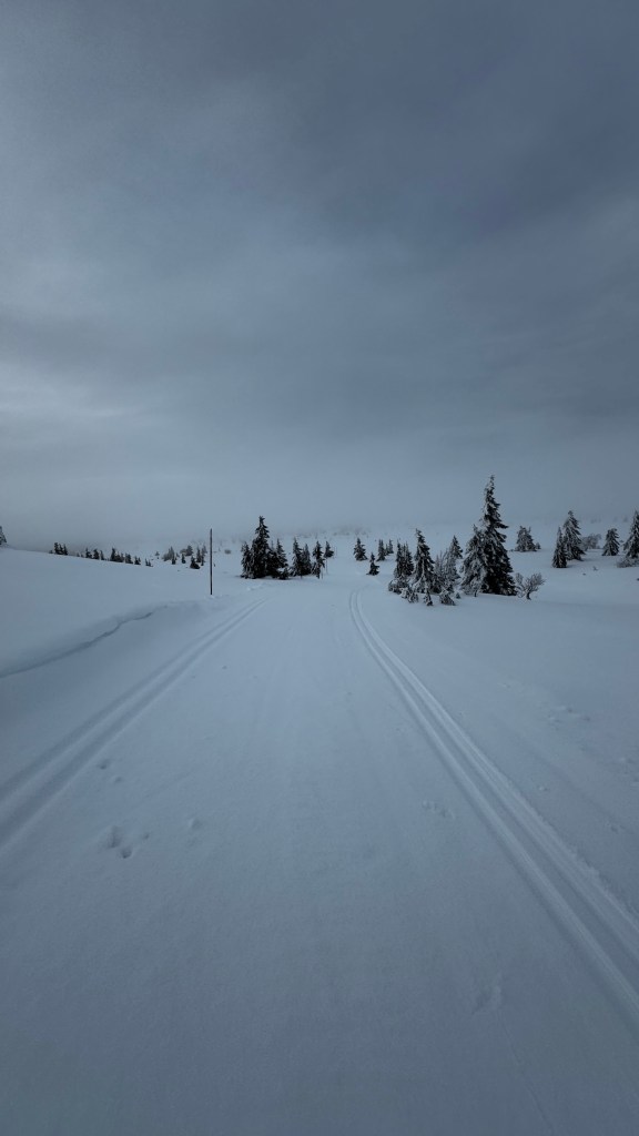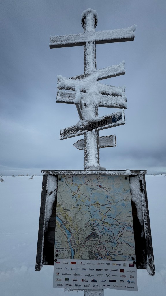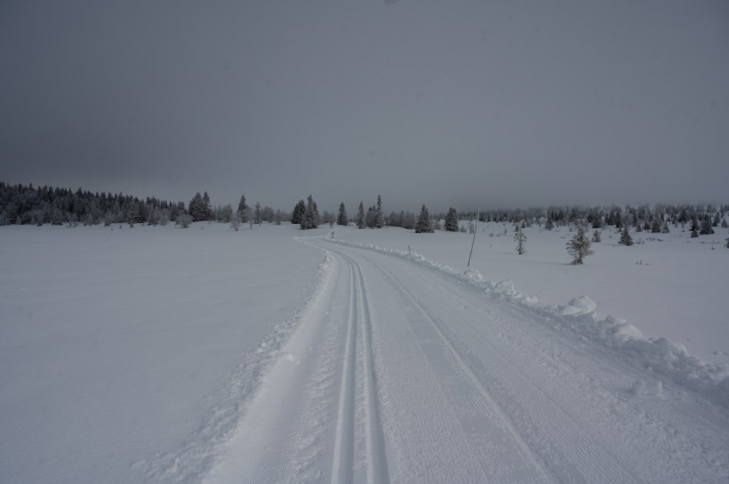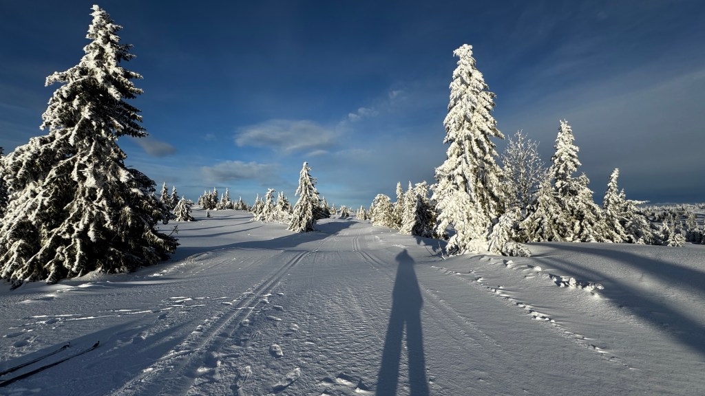 Ich setze mich wieder in Bewegung und folge dem Abzweig nach Rognhaugen. Es geht direkt zwischen ein paar Ferienhäusern den Berg hoch. Das Gelände wird ein wenig hügeliger und verlangt mir die nächsten dreieinhalb Kilometer einiges ab. Dann kommt der letzte Hügel hoch nach Rognhaugen. Ich stehe hier oben am Wegweiser, pfeife gefühlt aus dem letzten Loch und mache eine wohlverdiente Pause. Kurz vor mir sind zwei Langläufer angekommen, die sich, soweit ich es verstehe, über den Weg unterhalten. Ich schlürfe meinen Tee und genieße die Aussicht über das umliegende Gelände. Was mir auffällt, ist, wie wenig Schnee hier in diesem Jahr liegt. Aber das Gefühl hatte ich schon die ganze Zeit unterwegs. Und so sitze ich hier, krame mein Smartphone raus und suche Fotos aus 2020 von dieser Stelle.