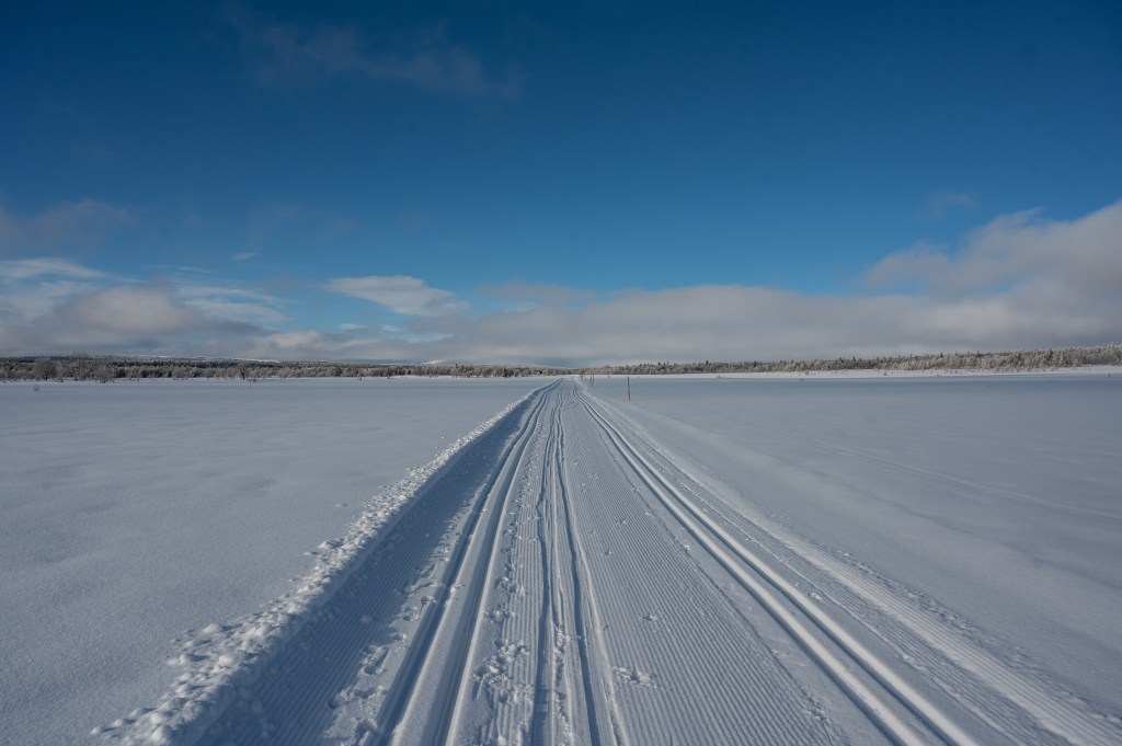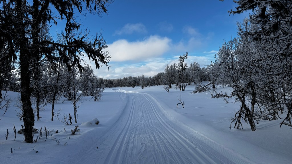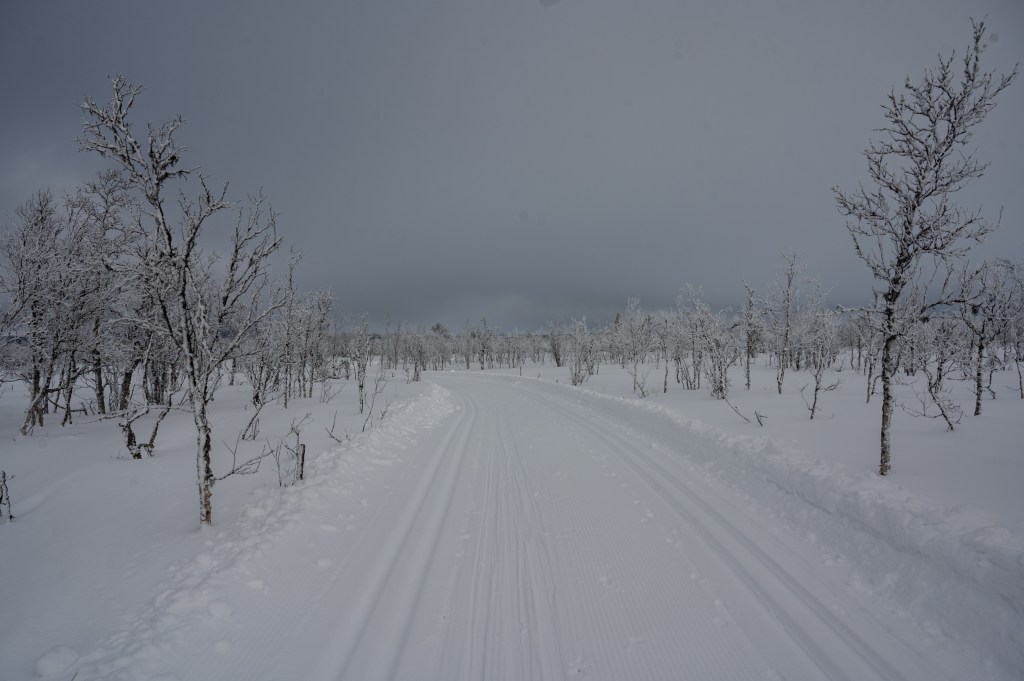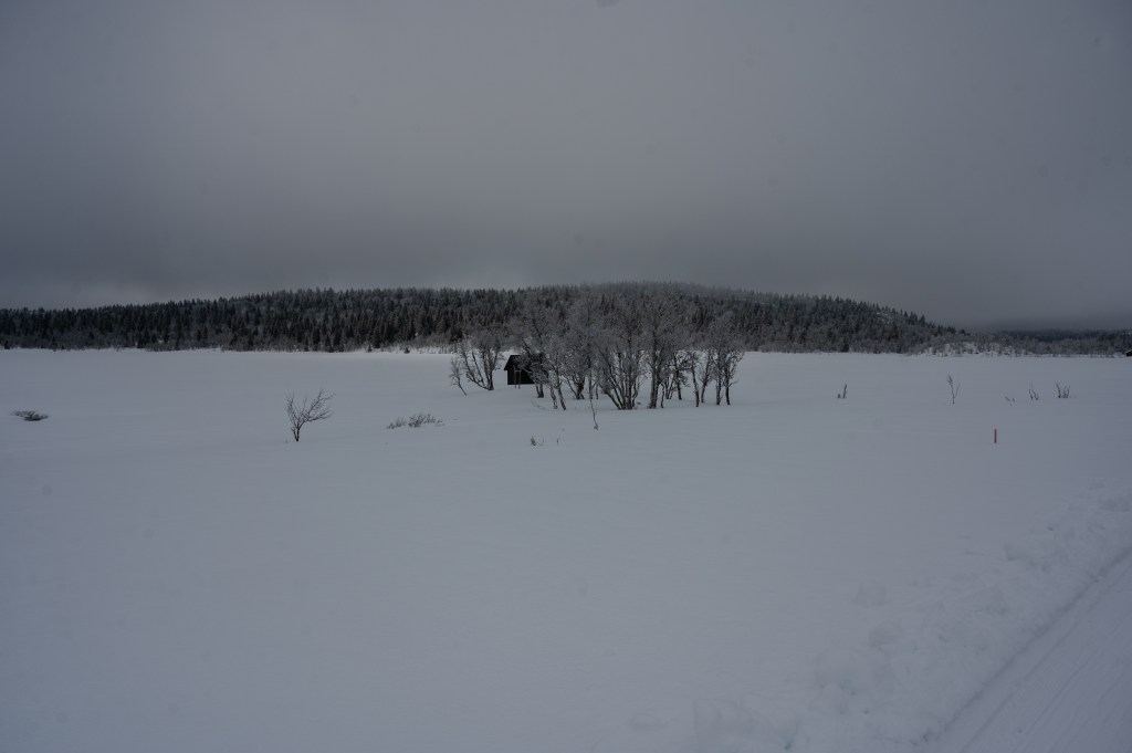 Auf halber Strecke geht es noch einmal kurz durch lichten Birkenwald. Dahinter folgt dann wieder offenes Moor. Die Loipe verläuft nochmals in einer langen Linkskurve, an dessen Ende dann die Vetåbua kommt.