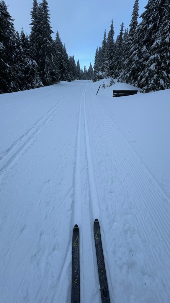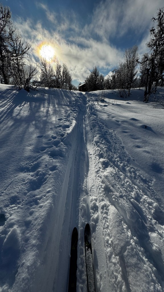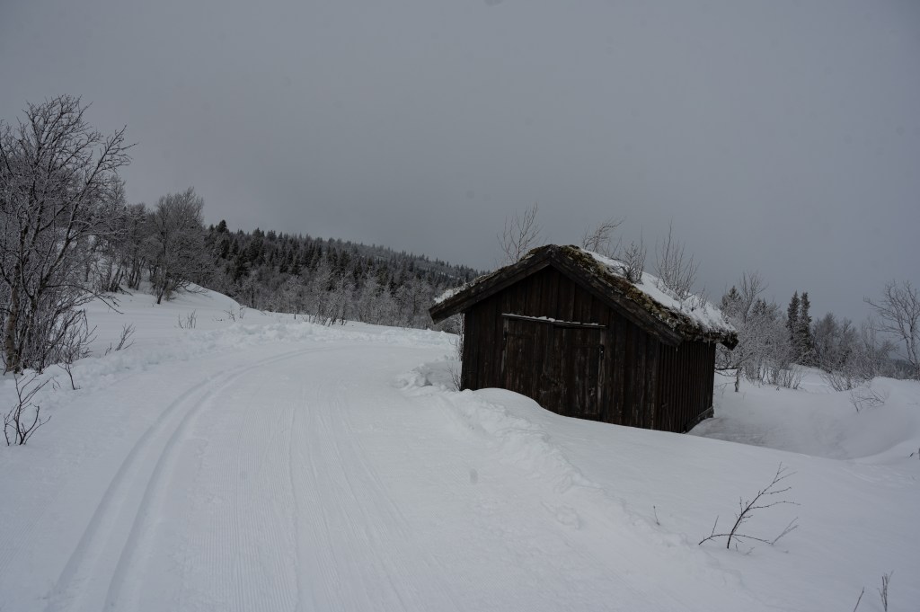 Bei Nysætra angekommen, muss ich feststellen, dass die Loipe wohl diesen Winter nicht bedient wird, und jetzt noch querfeldein zu laufen, darauf habe ich echt nicht mehr den Sinn. Also weiter der Loipe nach und zwei zusätzliche Kilometer auf der Troll-Loipe. So langsam schleppe ich mich auch nur noch über die Piste. Die Luft ist für heute gänzlich raus, die Schulter zieht höllisch, und ich mache drei Kreuze, wenn ich gleich an der Wandervereinshütte angekommen bin. Dann kommt endlich der Abzweig, dem ich nun 4 Kilometer bis zur Straße folge. Irgendwann kommt auch diese in Sicht, und es geht an die letzte Etappe für den Abend. Ich quäle mich die Loipe hoch bis zur Hütte, und witzigerweise habe ich diesen elendigen Anstieg noch genauso in Erinnerung wie bei der letzten Tour.