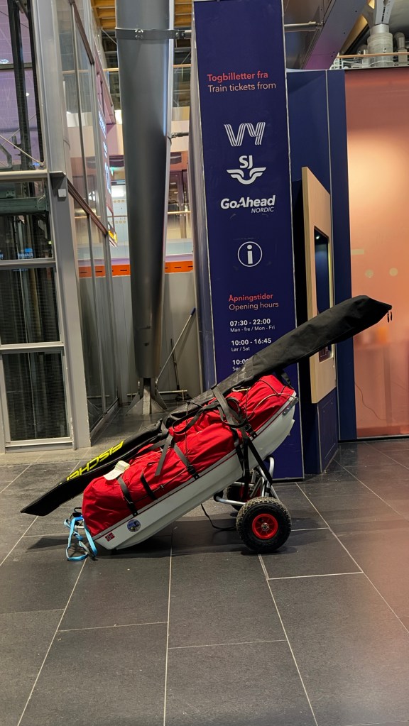 Zumindest vergeht die Zeit ein wenig angenehmer, während ich auf meinen Anschlussflug warte. Endlich um 17.50 Uhr geht es weiter und um 19 Uhr bin ich in Oslo Gardermoen angekommen. Bis mein Gepäck am Sperrgepäckschalter ankommt, dauert es noch ein wenig. Aber dann rollen die Sachen vom Band. Ich mache die Pulka wieder fahrbar und ziehe mein Geraffel hinüber zum Bahnhof. Der Zug kommt eine Dreiviertelstunde später und dann geht es gen Lillehammer. Dort komme ich kurz vor 22 Uhr an. Im Stasjonen Hotel, also im Bahnhofshotel, habe ich mir ein Zimmer für die Nacht gebucht. Ich schleppe alles hoch in das kleine Zimmer und falle nur noch ins Bett.