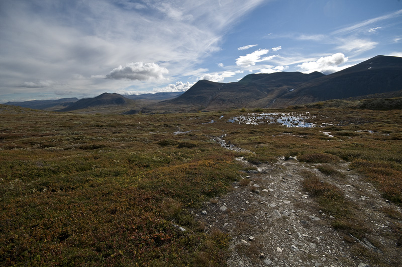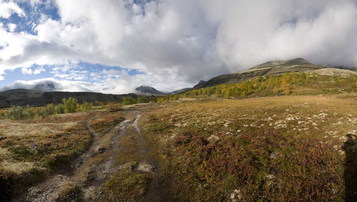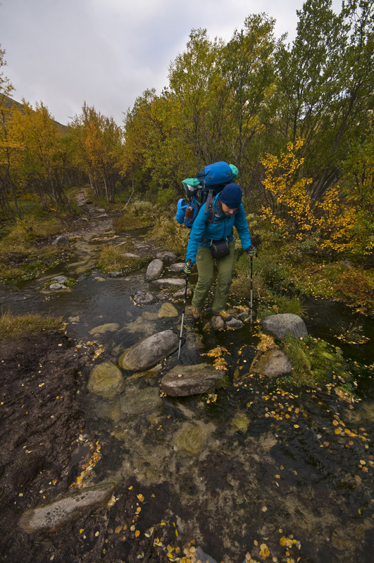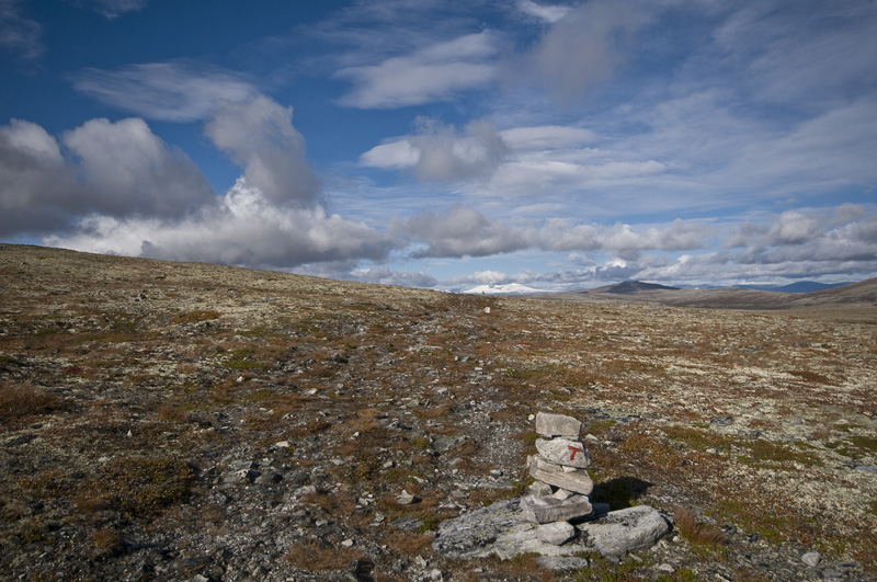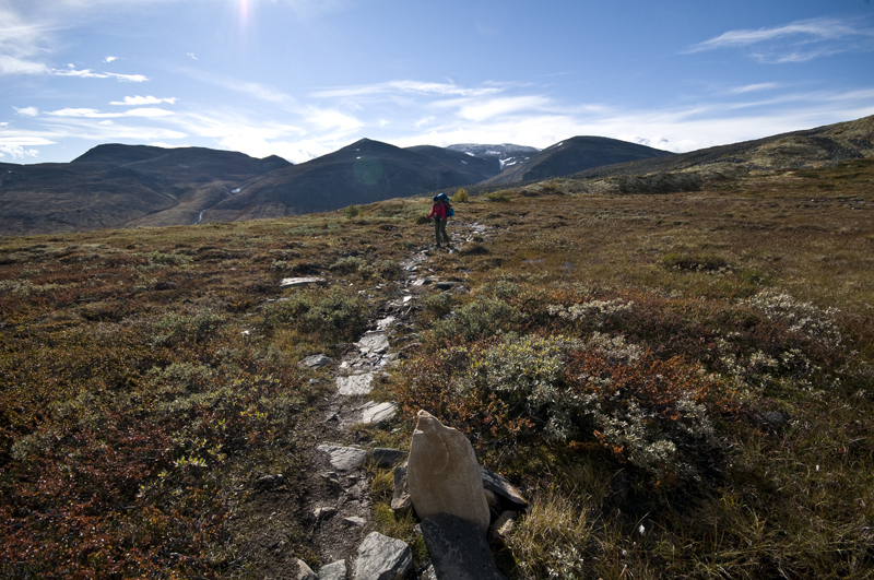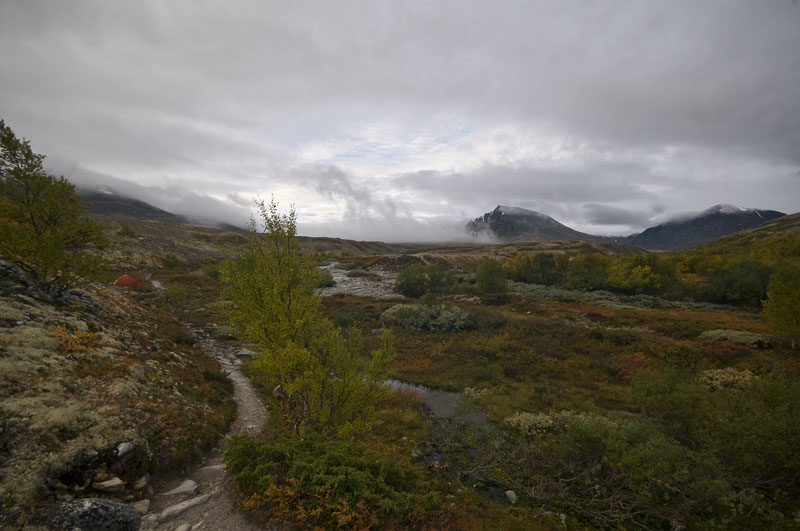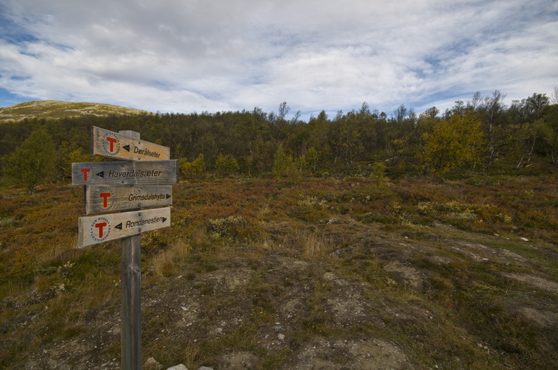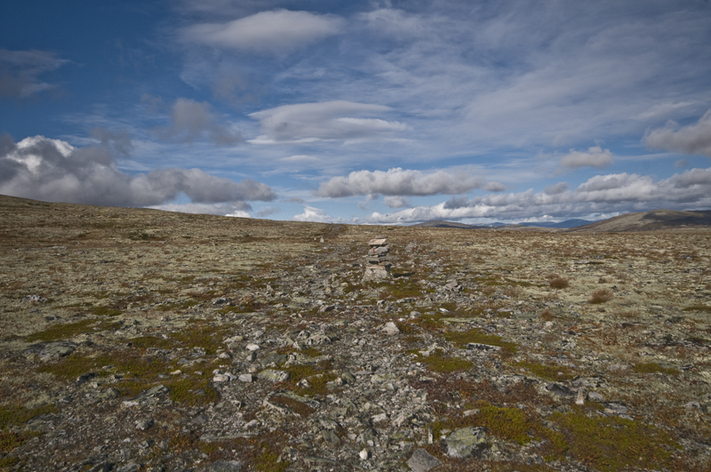 Nach dem frühstück wird zusammen gepackt und schicken uns an dem Weg zu folgen. Dieser ist an ein paar Stellen zu einem reißenden Bach mutiert und wir müssen uns durchs sumpfige Fjell schlagen. Bald entecken wir den Wegweiser und wissen endlich wieder wo es hoch geht.