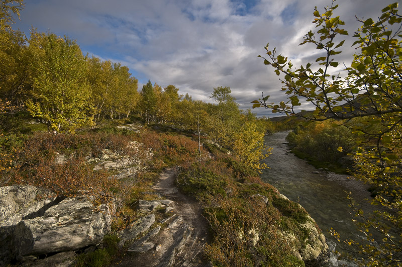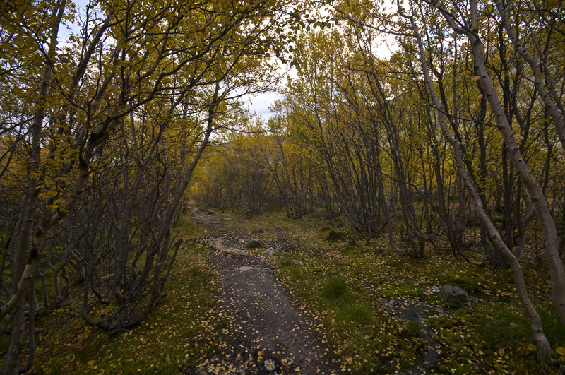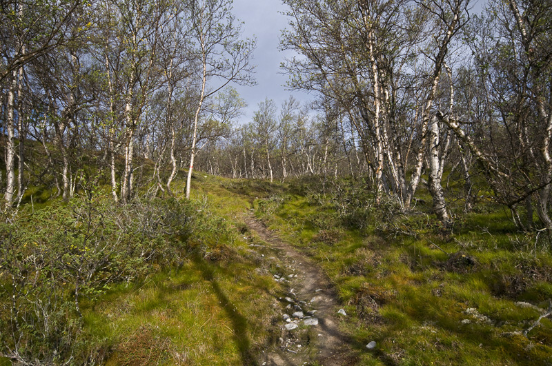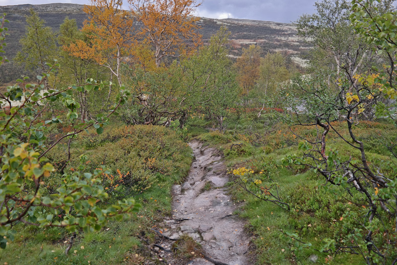 Wir laufen weiter bergab und in der Ferne kann man bereits die Grimdalshytta erkennen. Wir schätzen den Weg noch auf gute 4km. Wir überqueren die Baumgrenze und tauchen wieder ein in einen Birkenwald. Nun gehts steil bergab. Der Regen der letzten Tage hat den Boden ziemlich aufgeweicht man rutscht den Weg nur so hinab. Unser Weg verwandelt sich abermals in einen Bach dem wir weiter hinab folgen. Im Tal angekommen dürfen wir noch einmal einen Wildbach durchqueren, dann steigt der Weg noch einmal kräftig an um dann wieder sanft zum Grimsdalen hin abzufallen