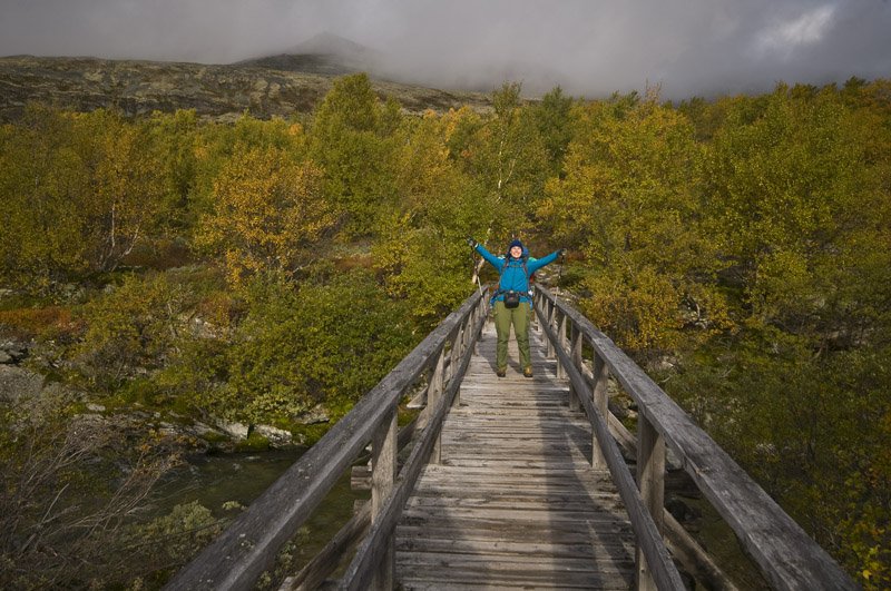 Vor der Brücke treffen wir noch auf einen Tschechen der die Nacht zuvor auf der Hütte genächtigt hatte und nun entweder zur Rondvassbu oder zur Bjørnhollia will. Wir unterhalten uns ein wenig und wir erklären ihm das der Weg zur Rondvassbu ein ganz schöner Brocken ist. Unser GPS zeigt bereits 20km an. Nachdem wir uns getrennt haben gehts über die Brücke und hoch zur Hütte.