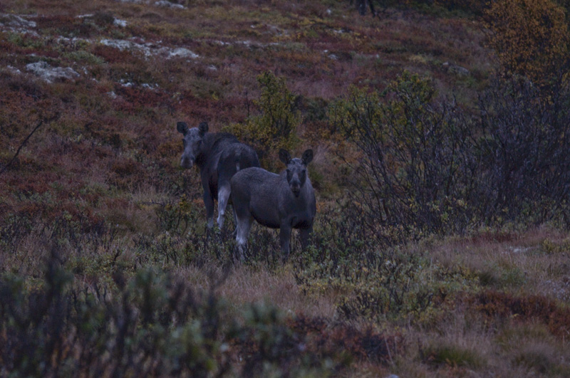 Wir bauen das Zelt in einer Regenpause auf. Schnell werden die Isomatten aufgeblasen und die Schlafsäcke ausgepackt. Wir sitzen kaum im Zelt fängt es auch schon wieder an zu regnen. In einer Regenpause, der xten an diesem Tag, bau ich vor dem Zelt den Kocher auf und zaubere uns eine Kartoffelcremesuppe. Ich bin gerade fertig und ziehe mich ins Zelt zurück fängt es auch schon wieder an zu schütten. Wir essen und während der nächsten Pause kriech ich wieder heraus um einen Tee zu kochen. Als ich heraus komme traue ich meinen Augen nicht. Nur gut zehn Meter vom Zelt entfernt stehen die beiden Elche. Die Mutter und ihr Jungtier schauen mich an und machen noch nicht einmal anstalten die Flucht zu ergreifen. Ich bücke mich schnapp mir die Kamera und bewege mich langsam auf die beiden zu. Leider fängt es schon an zu dämmern, daher verhau ich ein Bild nach dem nächsten. Je öfter ich auf den Auslöser drücke um so neugieriger wird das Jungtier. Ich löse aus und es macht einen Schritt auf mich zu. Daher beschließe ich ein wenig auf Abstand zu gehen. Nadine mitlerweile auch vorm Zelt und schaut den beiden fasziniert zu.