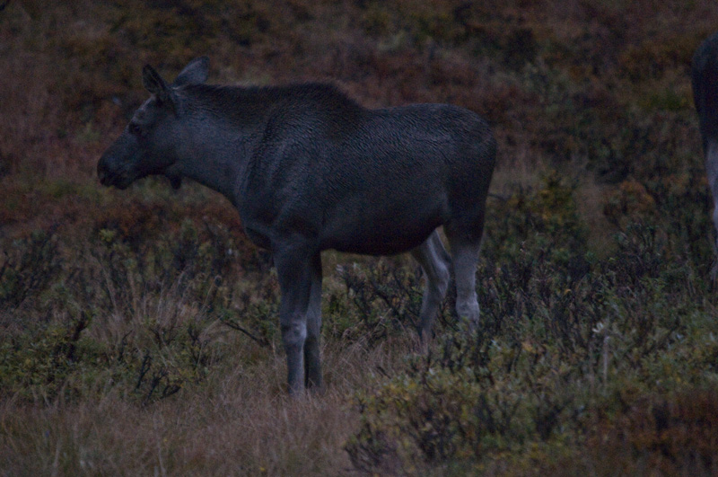 Die Elchkuh stört sich an unserem treiben kein Stück und lässt uns in aller Ruhe ihr Junges fotografieren. Irendwann aber haben beide genug uns ziehen langsam ab. Ich stehe da und kann nur noch grinsen. Mit so etwas hätte ich im Traum nicht gerechnet. Was für ein Abend.