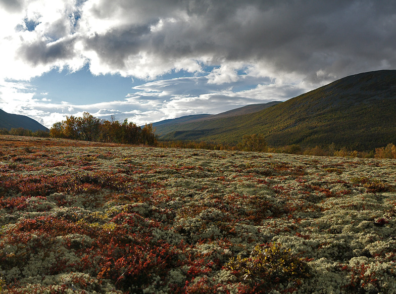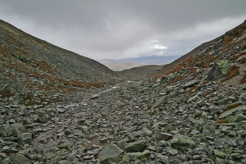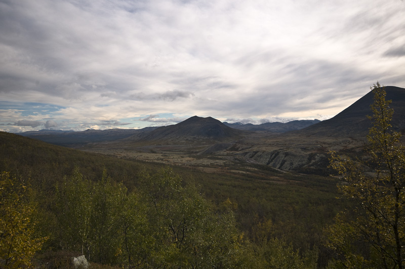 Nach etwas über einer Stunde haben wir den Abstieg auch fast geschafft und können über den Anblick des Tales vor uns gar nicht genug bekommen. Es ist traumhaft hier. Vor uns erstrecken sich Birkenwälder an den Hängen. Rechts neben uns rauscht der Bergbach zu Tal und unten im Tal rauscht die Haverdasåe hindurch. Der Anblick wäre noch besser wenn es nicht ständig anfangen würde zu schütten wie aus Kübeln. Immer wenn man meint man hat es hinter sich geht es wieder los.