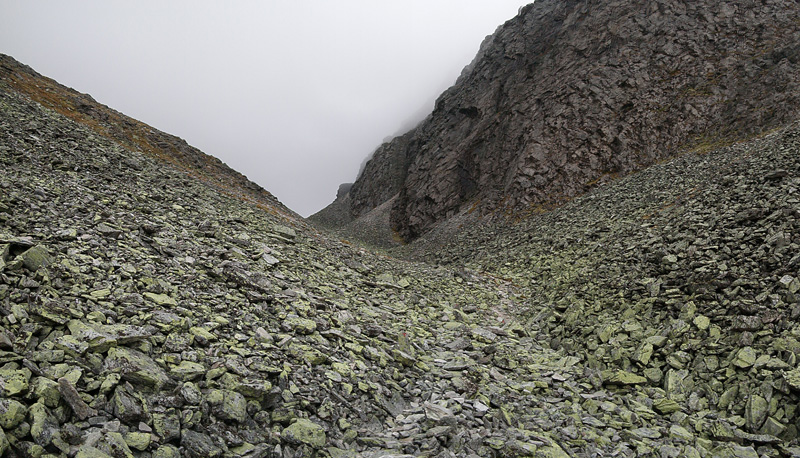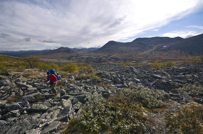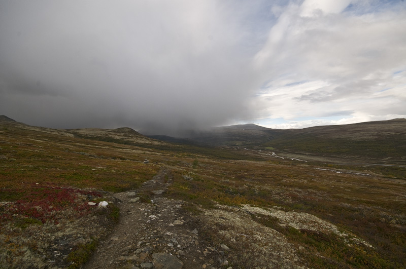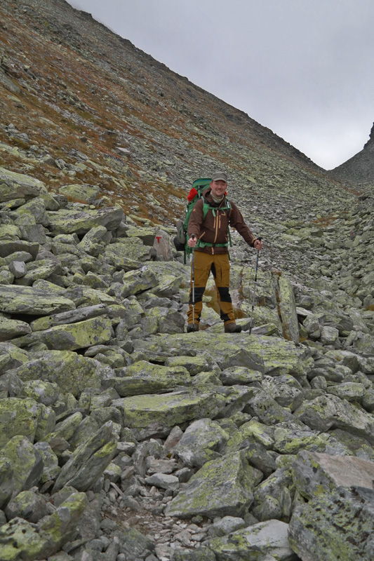 Wir machen uns auf den Weg hindurch. Vorgenommen haben wir uns die Grimdalshytta in 17km Entfernung. Nachdem wir etwa eine halbe Stunde im Blockwerk umher kraxeln, der Weg ist schwieriger geworden und man muss ihn auch suchen, zieht es sich schnell zu. Der erste Regen fällt und macht jeden Tritt auf den Fels zu einer Rutschpartie. Ich hab noch den Kaffee von dem Sturz zwei Tage zuvor offen und mein Fuß meldet sich auch brav bei jedem falschen Tritt.