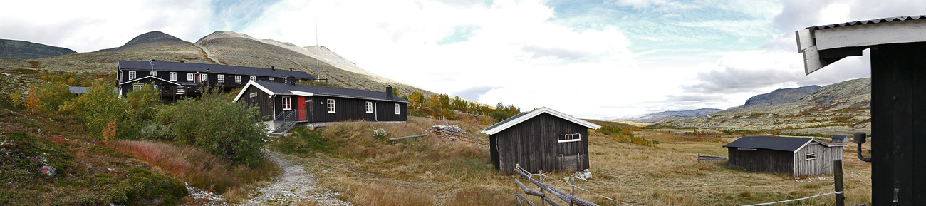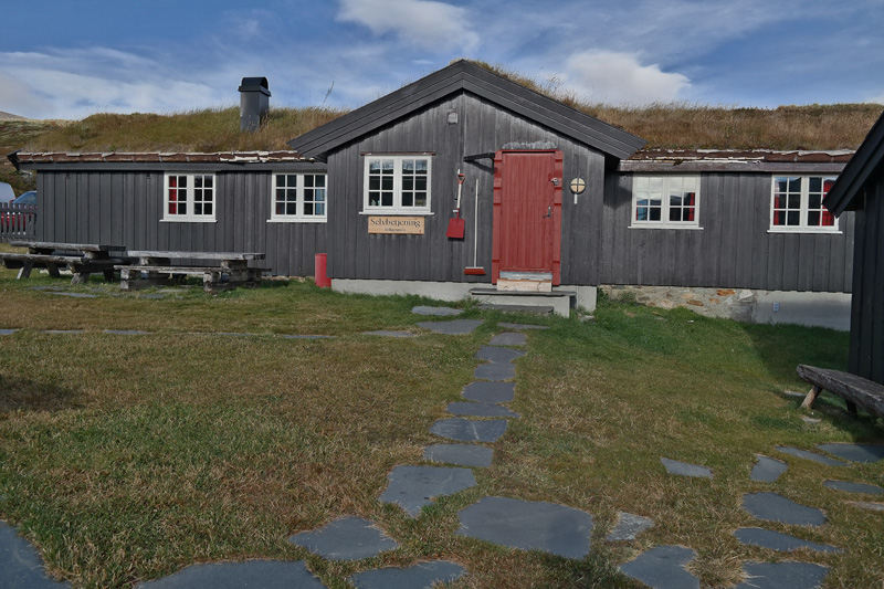 Wir kommen aus dem Birkenwald heraus, queren die Grimse über eine Brücke und stehen mitten auf einem Campingplatz. Wir entscheiden uns weiter zu gehen. Auf der anderen Seite des Campingplatzes liegt oberhalb der Strasse die Grimsdalshytta auf einem Kamm gelegen. Wir laufen die Schotterpiste zur Hütte hinauf und müssen leider feststellen das die Hütte seit dem 14.09 geschlossen hat. Beziehen wir halt die Unbewirtschaftete Hütte.