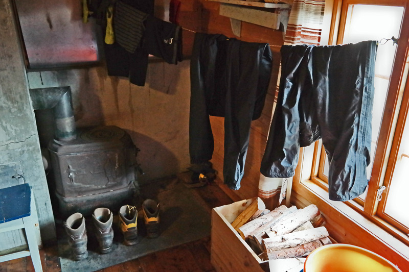 Nadine macht sich auf den Weg Wasser zu holen und ich geh in den gegenüber liegenden Schuppen um Brennholz zu holen und anmachholz zu hacken. Nachdem genug Holz vorhanden ist und auch Wasser da ist machen wir es uns bequem. Wir beziehen den kleinen Schlafraum und ich heize beide Öfen an. Nach kurzer Zeit bollern beide schön und verströmen eine behagliche Wärme. Den Tag vertrödeln wir, da mir ja bereits um halb zehn da waren, erst mit in der Gegend rum liegen, lesen, heiße Schokolade trinken und mehr faulenzen. Zwischendurch werden noch die Regenhosen vom Schmutz des Vortages befreit.