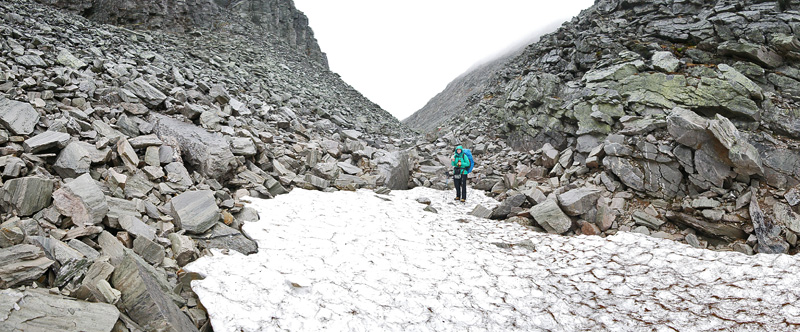 Nach unlaublichen vier Stunden für 4km haben wir es endlich geschafft. Der Weg schlängelt sich gen Tal. Juhu! Aber zu erst müssen wir noch zwei Altschneefelder queren.