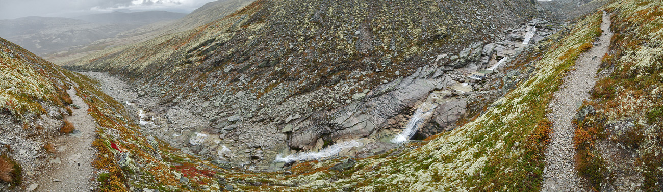 Wir packen schnell unsere Sachen zusammen und machen uns auf dem Weg weiter zu folgen. Der Fluss der noch am Zelt zwischen Birken, Büschen und Sträuchern hindurch floss stürzt nun in einen Canyon. Ein Wahnsinns Anblick. Wir folgen dem Fluss oberhalb auf unserem Weg. Nach ein paar Kurven kommt auch endlich die Dørålseter in der Ferne in Sicht. Noch ist sie ziemlich weit weg. Das hätten wir nicht mehr geschafft gestern.