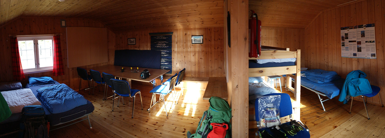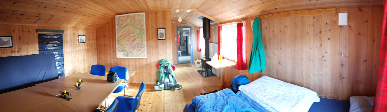 Wie wir feststellen sind wir nicht alleine. Die beiden zweier Zimmer sind bereits belegt. Also machen wir uns erstmal im Bettenlager breit. Dieses hat jedoch keinen Ofen. Der andere Wohnraum hat zwar einen, aber dort gibt der Rauchmelder in regelmässigen Abständen laut. Nachdem wir die Hütte erkundet haben finde ich in einer Schublade der Küche einen Satz Batterien. Ich schnappe mir einen Stuhl und mache mich am Rauchmelder zu schaffen. Endlich Ruhe! Wir schnappen unsere Sachen und beziehen den anderen Raum. Schnell habe ich Holz im Ofen und nach nur kurzer Zeit macht sich eine behagliche Wärme im Raum breit.