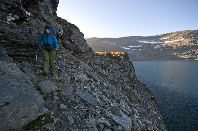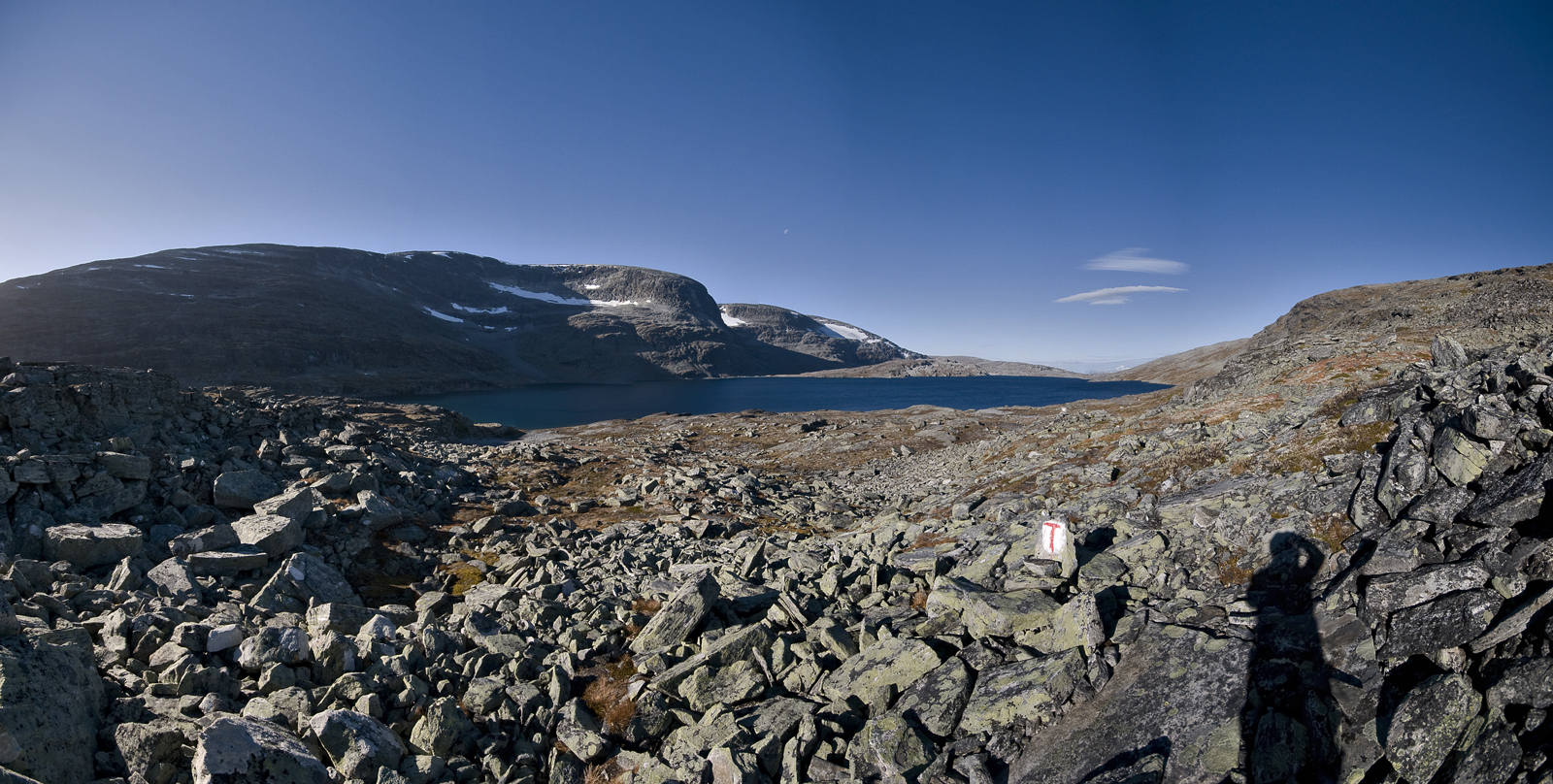 Wir queren nochmals einen Bach, dann stehen wir vor einer Steilwand. Scheiße denke ich mir, wo kommt die denn her und wo ist der Weg. Irgendwann endtecke ich das erste rote T in der Wand. An der Steilwand liegen Geröllblöcke verteilt an denen man wie bei einer Treppe die Wand hinauf kommt. Langsam und mühselig kämpfen wir uns hoch, nur um dann festzustellen das wir noch gar nicht am Ende sind. Es folgt noch einmal eine Berg und Talfahrt während es bereits langsam anfängt zu dämmern. Kein Wunder es ist auch schon nach 18 Uhr. Nach einem weiteren halben Kilometer bergab sehen wir am Ufer des vor uns liegenden Litlvatnet die Loennechenbua liegen. Endlich!