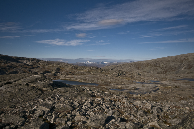 Wir laufen weiter und begegnen nur ein paar Minuten später einer Gruppe von vier Norwegern. Sie fragen uns natürlich gleich ob wir die Rentiere gesehen haben. Aus ihrer Begeisterung in den Stimmen schließen wir einfach das es anscheinend nicht ganz so oft vorkommt das man so viele Tiere auf einmal zu Gesicht bekommt. Nach einer kleinen Unterhaltung trennen sich unsere Wege. Jetzt tauchen wir langsam aber sicher ab ins Skirådalen und von nun an heißt es nur noch bergab.