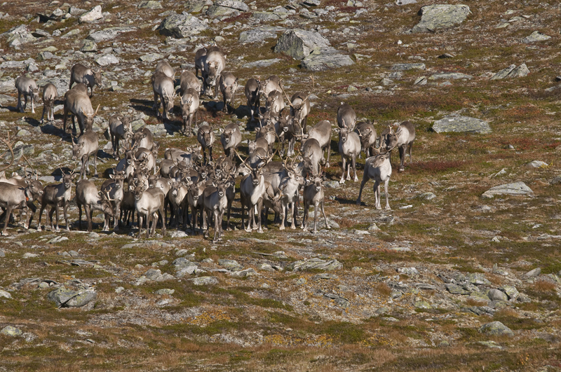 Wir steigen über einen steilen Pfad hinab und folgen unseren roten Wegweisern durch die Ebene. Wie wir vor uns hin trotten bemerken wir am Ufer des zu unserer rechten liegenden Sees bewegung. Am Berghang ist eine Herde Rentiere unterwegs. Nadine kramt mir aus dem Rucksack das Teleobjektiv raus und ich bewege mich langsam auf die Herde zu. Jedes mal wenn sie mich sehen beginnen sie los zu traben um nach kurzer Zeit wieder anzuhalten. Irgendwann scheint die Gruppe auf mich neugierig zu werden. Wohl weil sie wissen das ich kein Jäger zu sein schein und das uns ein See trennt. So stehe ich am Ufer des Sees und die Rentierherde nur 100-150m von mir entfernt. Überwältigend! Ich lasse den Auslöser der Kamera gar nicht mehr los und schieße ein Foto nach dem anderen.