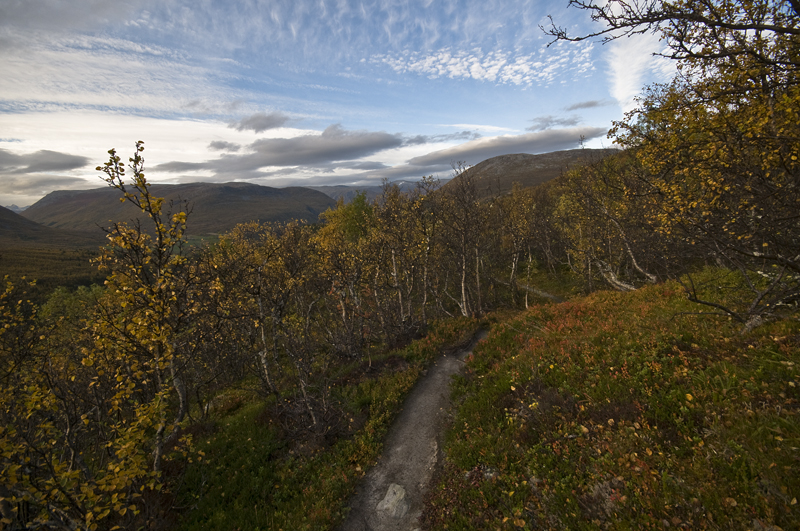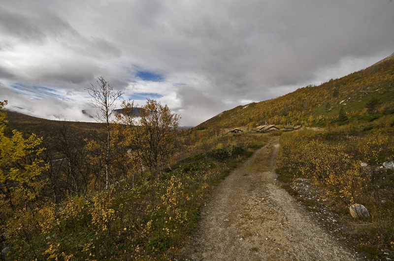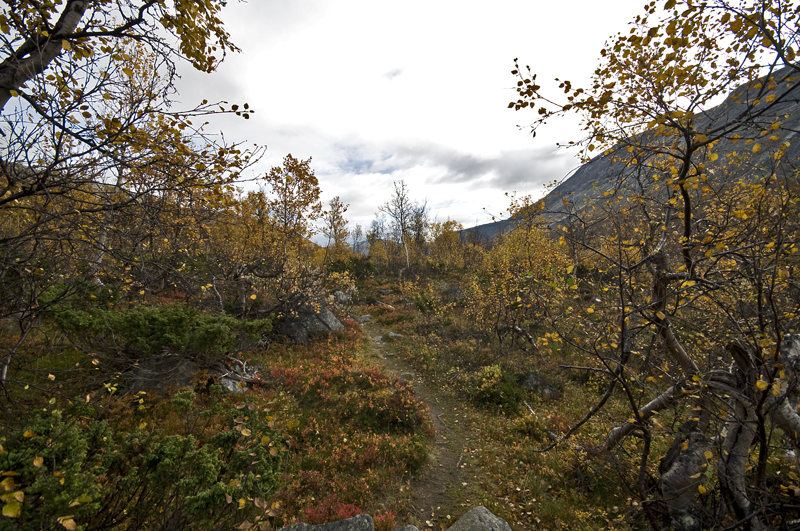 Um halb zwölf stehen wir abmarschbereit vor der Hütte. Bis zur Dindalshytta sind es nur 14km durch das Dindalen. Wir folgen der Schotterpiste für ein paar Kilometer, dann taucht ein Trampelpfad in den obligatorischen Birkenwald ein.
