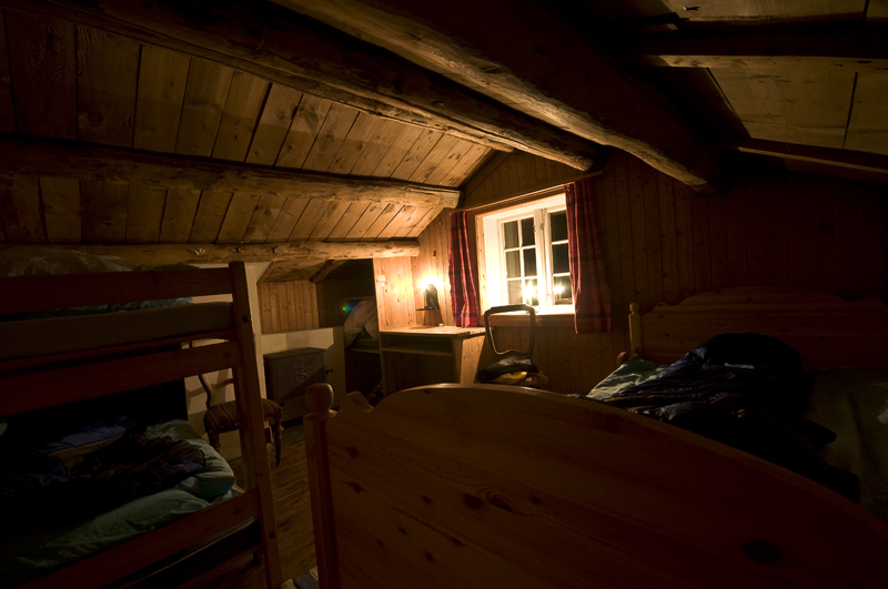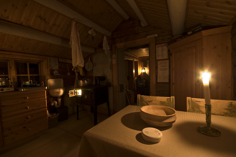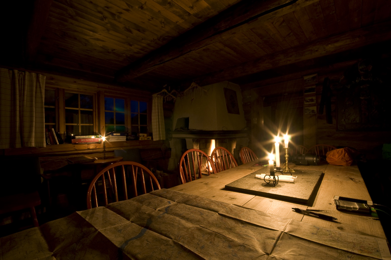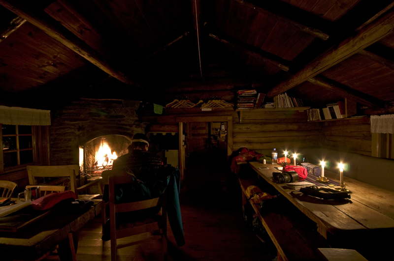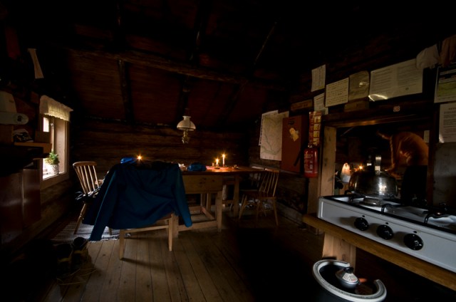 Diese wählen wir als unser Domizil für die Nacht aus und richten uns auch so gleich Häuslich ein. Da es in der Hütte ziemlich dunkel ist machen wir uns Kerzen an und geben dem Kamin ordentlich zunder. Als dieser endlich brennt durchstöbern wir die Vorratskammer und machen uns was zu essen und einen Kakao. So versinken wir vor dem knisternden Kamin in der Ecke.