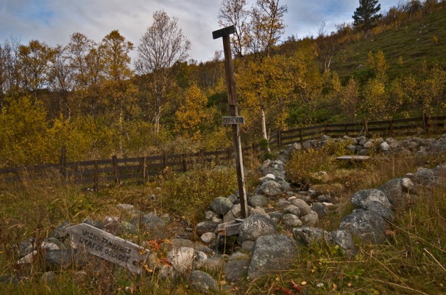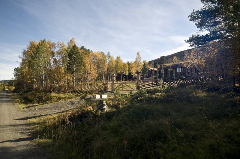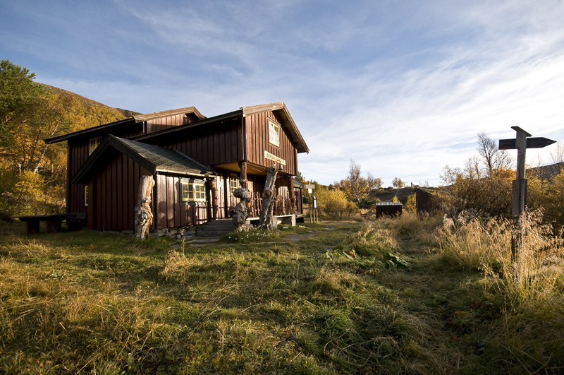 Hinter der Brücke gabelt sich der Weg und wir folgen dem rechten Abzweig zur Gammelsetra. So langsam brennen die Füße und wir sind echt froh als wir nach der xten Biegung endlich die Hütten hinter einer Einzäunung sehen können. Dort angekommen folgen wir wieder unserem festen Ritual. Rucksäcke runter und rein in das Haupthaus. Wir schauen uns die Stube, Küche und Schlafräume an und gehen rüber zur Hütte für Hundebesitzer und zur Gammelstua, der dritten Hütte.