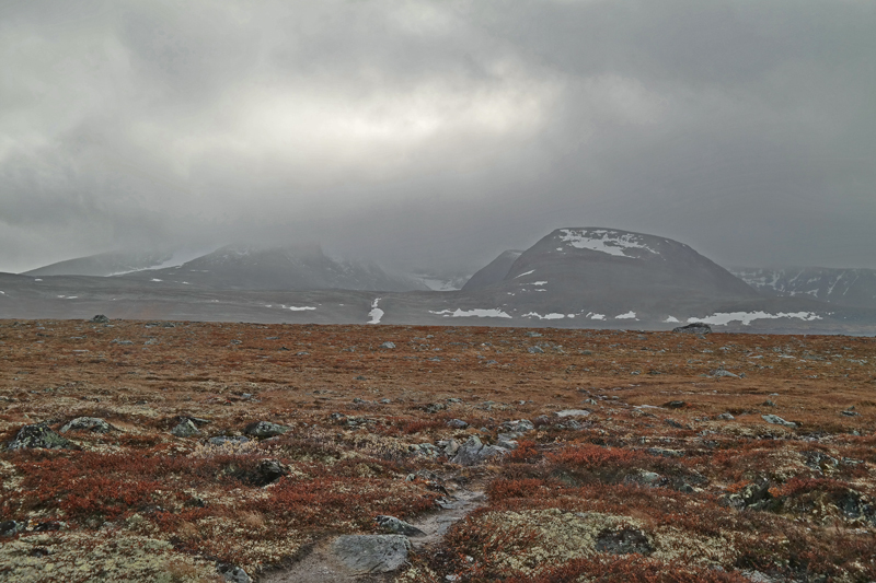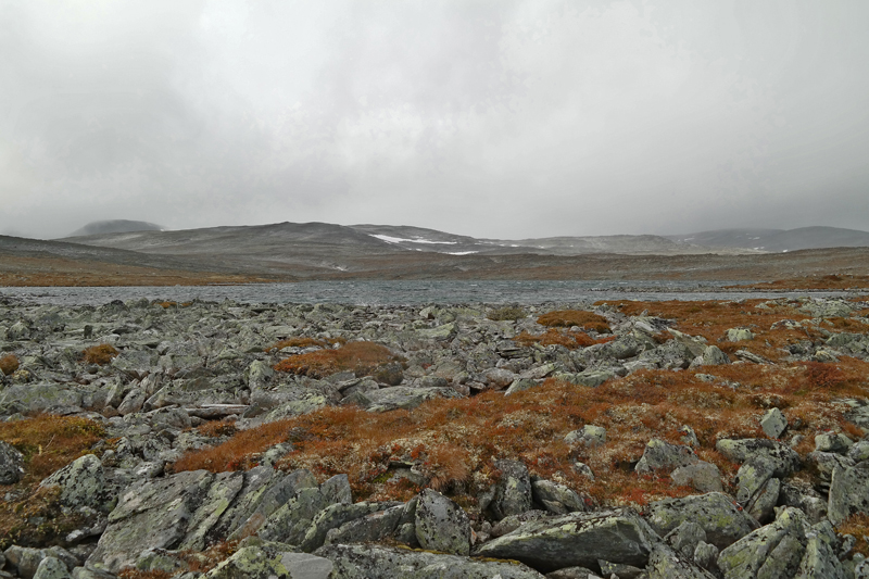 Nach dem Frühstück sitzen wir alle zusammen und diskutieren was man wohl machen sollte. Der Norweger muss weiter. Er will es heute noch zur 25km entfernten Dindalshytta schaffen. Für uns steht die Hütte erst in drei Tagen auf einem anderen Weg auf dem Programm. Die Niederländer wollen hoch zur Reinheim. Bei dem Wetter auch nicht ohne der Weg. Wir sitzen in der Stube vorm Radio und warten das die Nachrichten mit Wetterbericht kommen. Nachrichten ja, aber kein Wetterbericht. Der Norweger macht sich auf den Weg. Wir wünschen uns gegenseitig „god tur“, dann verschwindet er auch durch die Tür. Eine ganze Zeit beobachten wir ihn noch wie er sich durch die Landschaft kämpft. Dann beschließen wir verbliebenden auch um elf unser Glück zu versuchen. Wir können uns auch nicht noch mehr Verzögerungen leisten. Dann verschwinden auch die beiden Holländer. Sie folgen dem Weg den wir den Tag zuvor gekommen sind. Auch der Norweger hatte ihnen zu dieser Strecke geraten. Dann ist auch Nadine startklar. In die komplette Regenmontur gehüllt treten wir vor die Tür und sogleich zerrt der Sturm an uns und den Rucksäcken. Mit tief ins Gesicht gezogenen Kapuzen folgen wir dem Weg für 2 km durch die Ebene bevor es dann an den Aufstieg geht. Es macht echt keinen Spass bei dem Wetter. Beim Blick zurück schauen wir in Richtung Snøhetta. Aber der Berg ist nur zu erahnen.