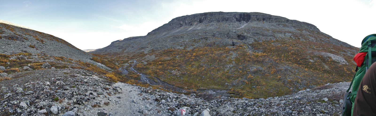 Nachdem wir den See geschafft haben geht es einen Anstieg hinauf von welchem wir eine überwältigende Aussicht in das unter uns liegende Flatskirådalen haben.