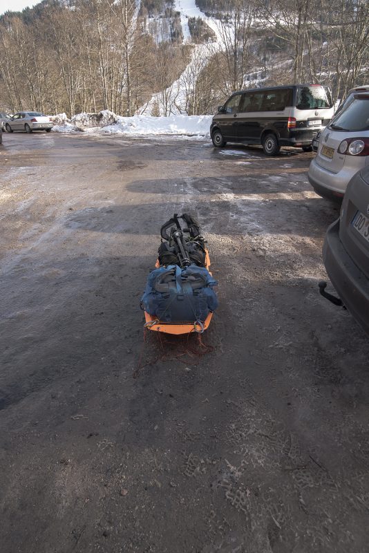 Sonntag Morgen sammelte ich ihn am Bahnhof in Freiburg ein und wir machten uns auf den Weg zum Feldberg. Dort kreisten wir erst einmal eine Weile und suchten einen ordentlichen Parkplatz für das Auto. Also dieser gefunden war, entluden wir unsere Sachen und verstauten alles auf dem Zugschlitten und trugen ihn bis zum Weg wo der erste Schnee lag.