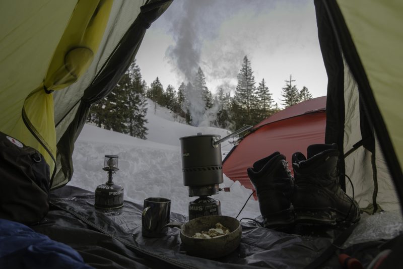 Am morgen weckte mich ein strahlend blauer Himmel. Ich kochte mir Wasser für Müsli und Kaffee und ließ die Aussicht an einem Allak vorbei auf den verschneiten Hang und den strahlend blauen Himmel.