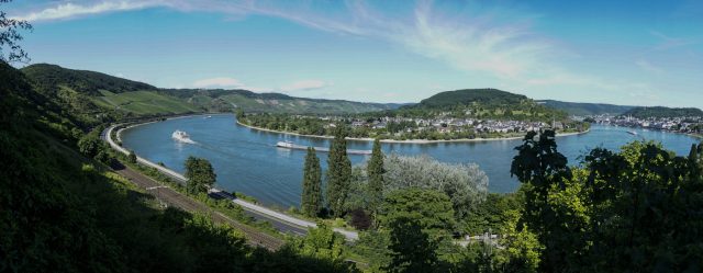 Nach diesem Anstieg, bei dem ich schon gut ins schwitzen gekommen bin, eröffnet sich mir ein erster großartiger Blick über die Rheinschleife und das Bopparder Hamm. Das Hamm ist das größte zusammen hängende Weinanbaugebiet des Mittelrheins und von dort kommen auch einige der besten Weine.