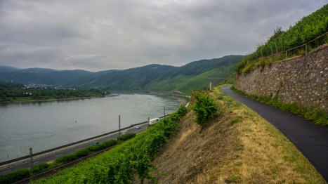 Und während es draussen richtig gießt gönne ich mir sogleich eine kurze Pause bei Müsliriegel und Tee. Als es zu regnene aufhört laufe ich weiter. Ich erreiche die Hänge des Bopparder Hamms und laufe durch die Weinberge hinab. Weit hinten in der Rheinbiegung kann ich Boppard erkennen.