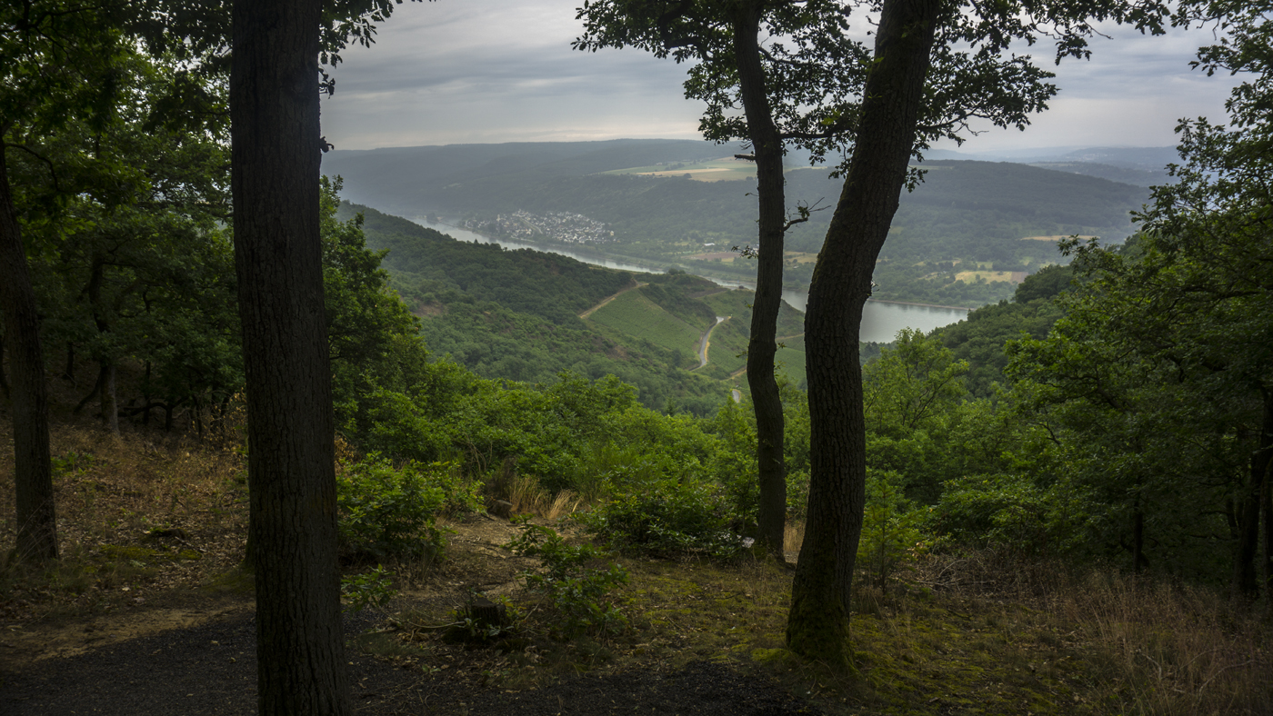 Nach diesem Anstieg, bei dem ich schon gut ins schwitzen gekommen bin, eröffnet sich mir ein erster großartiger Blick über die Rheinschleife und das Bopparder Hamm. Das Hamm ist das größte zusammen hängende Weinanbaugebiet des Mittelrheins und von dort kommen auch einige der besten Weine.