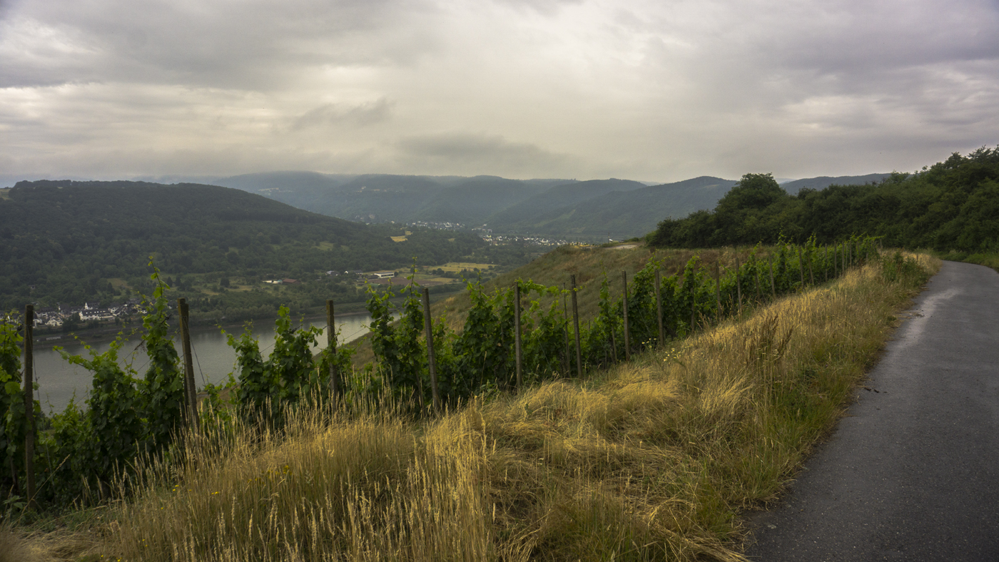 Und während es draussen richtig gießt gönne ich mir sogleich eine kurze Pause bei Müsliriegel und Tee. Als es zu regnene aufhört laufe ich weiter. Ich erreiche die Hänge des Bopparder Hamms und laufe durch die Weinberge hinab. Weit hinten in der Rheinbiegung kann ich Boppard erkennen.