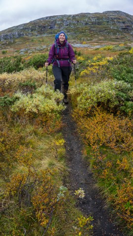 Um elf stehen wir dann doch endlich mit geschulterten Rucksäcken auf der Terrasse und folgen langsam dem Weg der durch das Hallaskardalen nach Hedlo führt. Wir folgen dem Weg für ein paar Kilometer durch Knie hohes Gestrüpp.