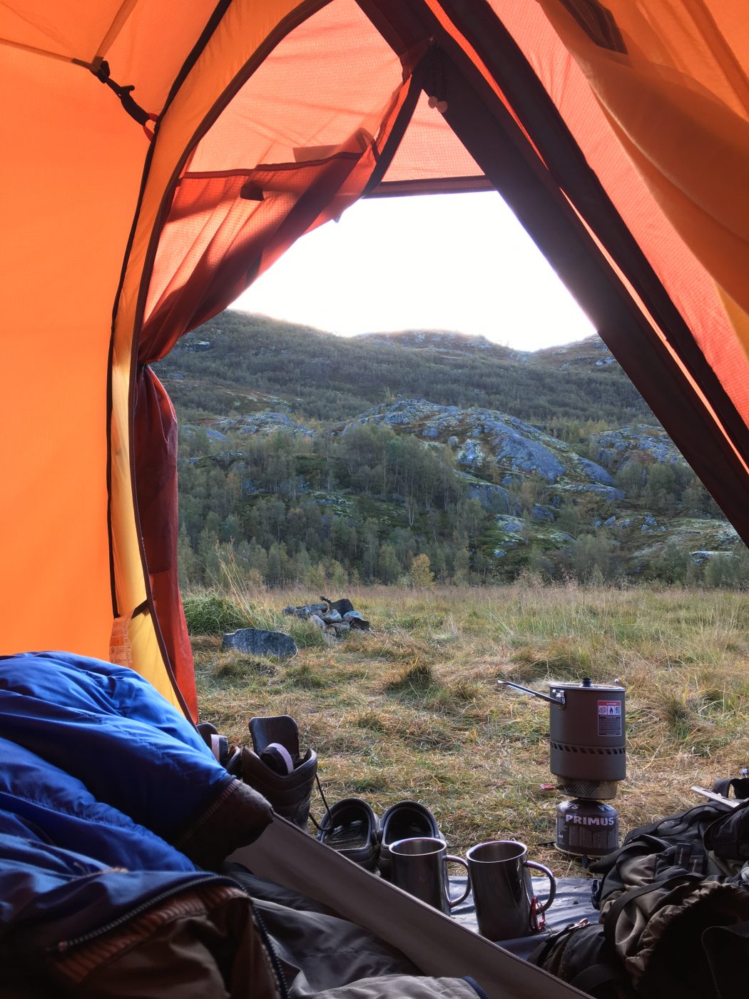 Wir bauen unser Zelt auf und schauen direkt auf die Austra Leirebottskåka. Leider zieht es sich schon die ganze Zeit immer weiter zu und das Wetter soll auch schlechter werden. Wie alles steht und wir uns ins Zelt zum essen zurück gezogen haben, fängt es auch passend an zu nieseln.