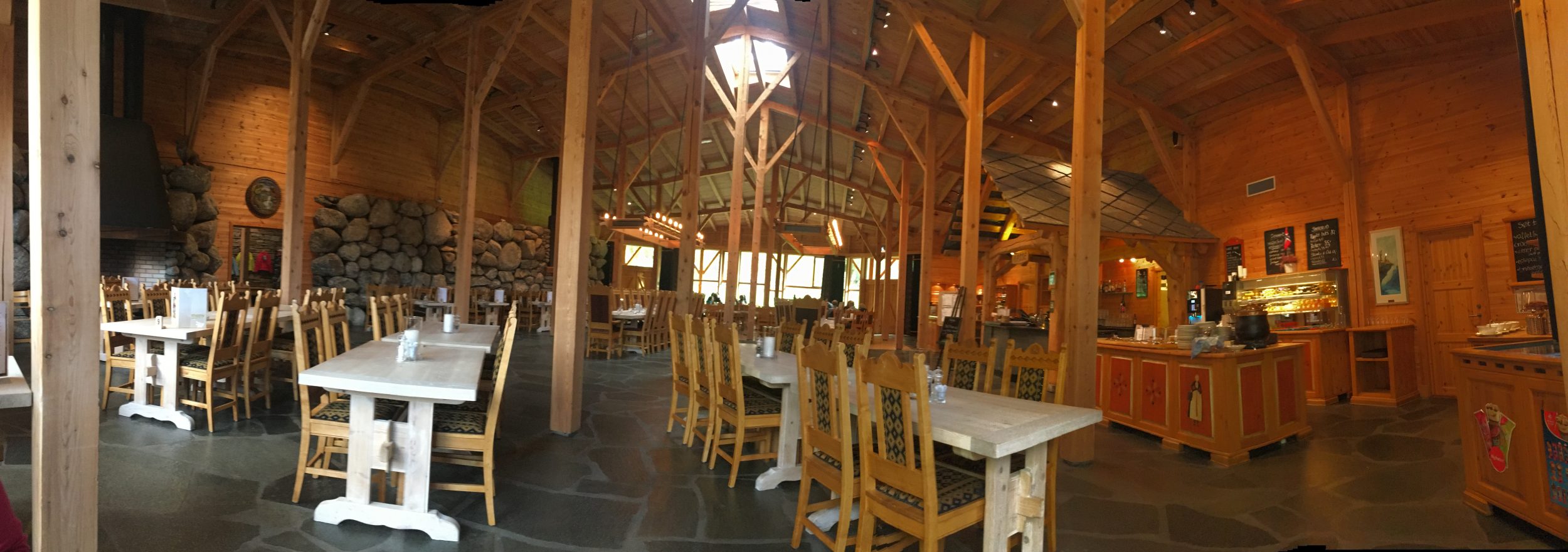 Am Mittag erreichen wir dann endlich Øvre Eidfjord und latschen so langsam auf dem Zahnfleisch in Richtung Ortszentrum. Total platt, was wohl auch am fehlenden Frühstück liegt, erreichen wir das Hardangervidda Naturscenter. Was uns nun aber gerade viel mehr als die Natur der Hardanger lockt sind die Hardangerviddahallen mit ihrem riesen Restaurant. Denn wir haben nur noch Hunger! Wir gehen in dieses riesige Restaurant das an eine Methalle erinnert und setzen uns in die Ecke. Auf der Speisekarte stehen so großartige Dinge wie Lachsburger, Lammburger usw. Uns läuft das Wasser im Munde zusammen und wir bestellen einfach.