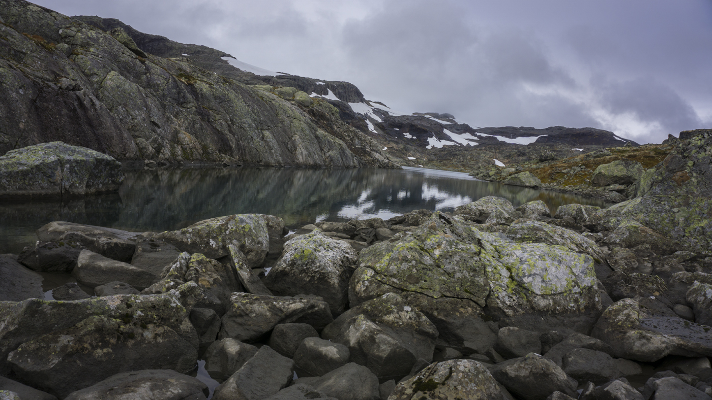 Wir laufen entlang des Skåltjørna und müssen an dessen Ende über den Ablauf eines Sees bestehend aus Felsblöken steigen. Der Weg geht schon wieder gut los. Denn das Gestein ist so glatt wie Schmierseife und ein ordentlicher Weg durch dieses Gesteinsfeld lässt sich auch nur schwer erraten. Dementsprechend dauert es ein wenig bis wir dort hindurch sind. Dann heißt es wieder einen steilen Anstieg zu erklimmen. Der Weg haut ganz schön rein und ist durch den Regen der letzten Nacht gut durchgeweicht.