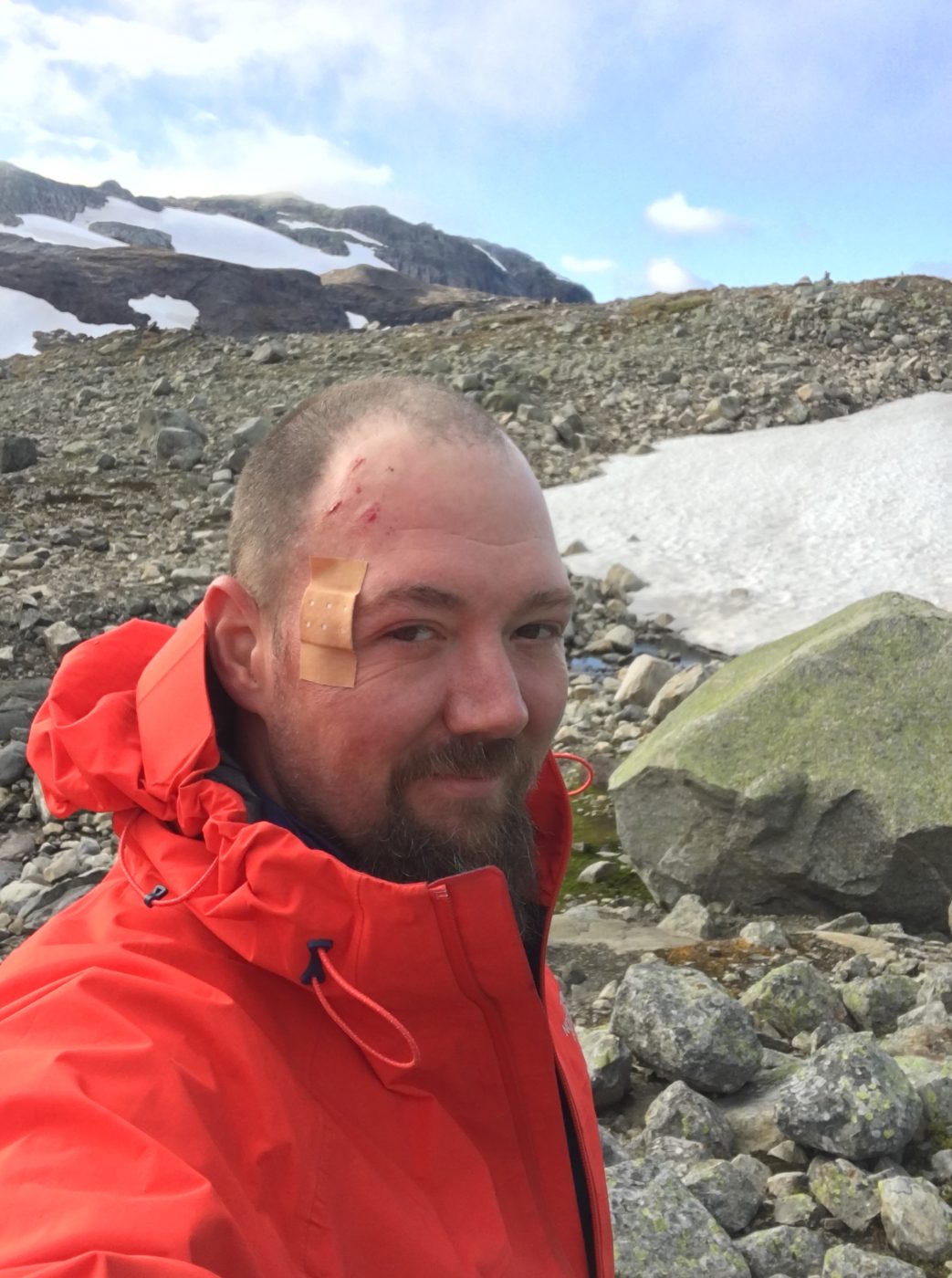 Wie sich heraus stellt habe ich an der Stirn eine Schürfwunde und knapp unter der Augenbraue eine etwas größere Macke. Aber dafür reicht ein Pflaster. Nadine möchte nun aber nicht mehr mit mir bis Finse laufen an diesem Tag, da sie befürchtet das ich einen Schock habe.