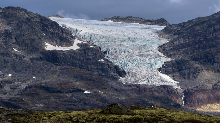 Wir laufen den Weg weiter und haben nun zu unserer linken die große Gletscherzunge Vestra Leirebottskåka, die sich zerfurcht den Hang hinunter zieht.