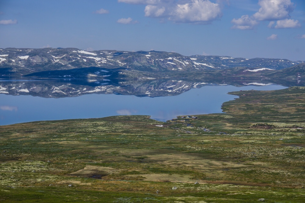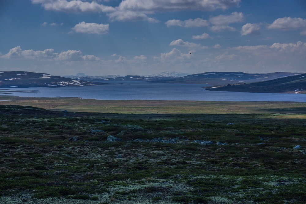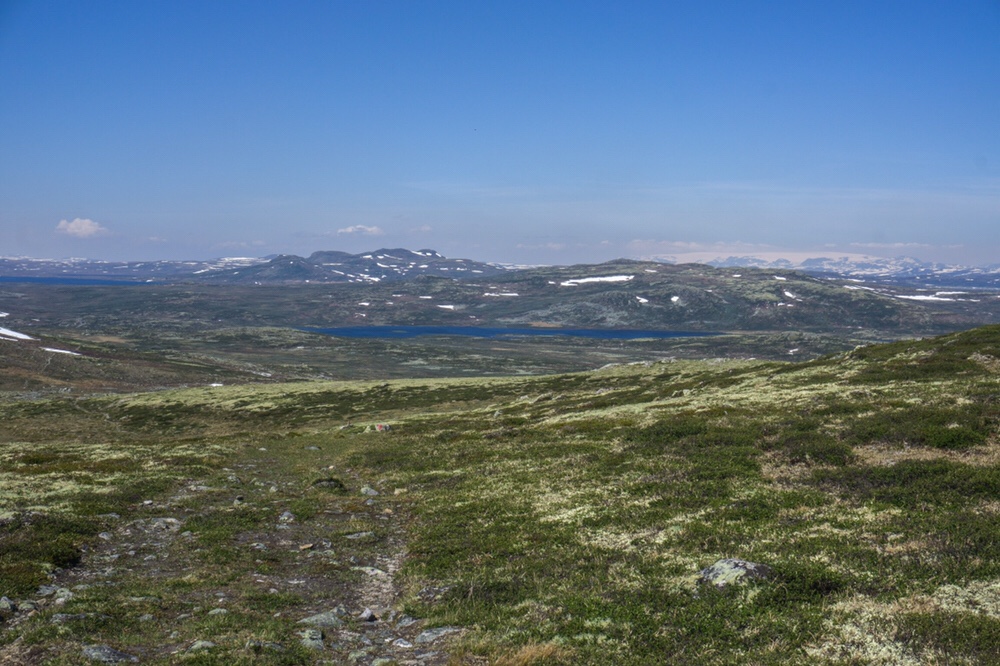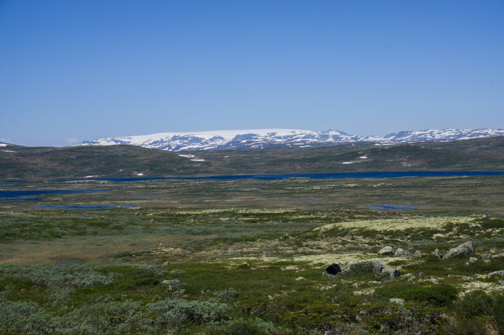 Dann kommt noch einmal ein sehr knackiges Stück Aufstieg und der Weg läuft langsam in ein kleines Tal hinab und führt auf eine kleine Schotterstrasse zu an der ich Pause mache. Martin muss ich schon vor einer Ewigkeit abgehängt haben. Ich schultere wieder den Rucksack und folge weiter dem roten T. Ich laufe über eine kleine Kuppe und bleibe stehen. Mir klappt unwillkürlich die Kinnlade hinunter. Ich stehe auf knapp 1400m und schaue hinunter in ein Tal mit einem grossen See zur rechten wo tosend ein Fluss hinein fliesst. Dahinter steigt eine Erhebung an, an dessen linken sich ein weiterer See anschließt. Dort seheh ich eine kleine Hütte am Rande. Ich nehme die Kamera und zoome hinein. Es ist in der Tat die Rauhelleren die ich da sehe. Aber was mich wirklich sprachlos macht ist die Bergkette die von rechts nach links den Horizont abschneidet und links in eine große weisse Kuppe mündet. Ist das wirklich der Hardangerjøkul den ich da sehe? Er muss es sein, dieses Bild habe ich noch vom letzten Jahr aus der westlichen Vidda im Kopf. Ich stehe eine ganze Zeit da und sauge das Bild in mich auf. Irgendwann steige ich dann in das Tal ab.