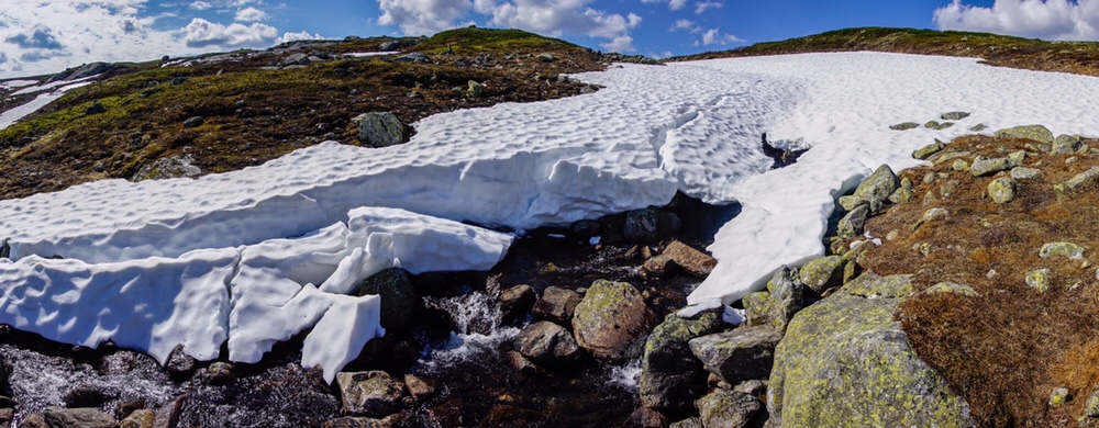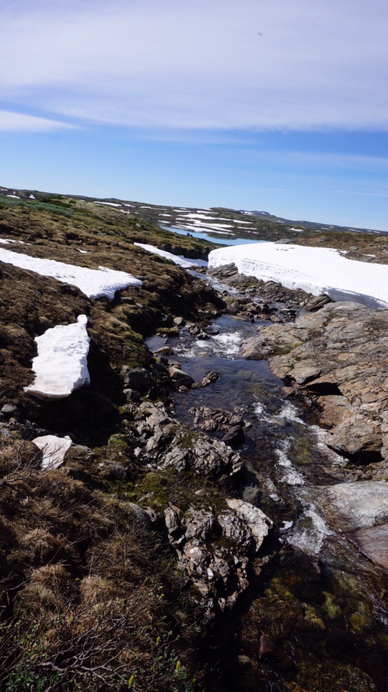 Am Tag drauf geht es wie schon seit dem Start bei besten Wetter zur Kalhovd. Der Weg schlängelt sich durch die Berge und es ist alles staubtrocken. Würde ich hier ein Streichholz falle lassen, ich glaube das Fjell würde sofort durch zünden. nach gut zwei Stunden erreiche ich ein größeres Schneefeld unter dem ein Bach durch gurgelt. Der Kombi traue ich nicht und ich versuche mein Glück etwa 200m weiter den Bach hinunter. Dort kann ich den Bach mühelos queren und steige wieder hinauf in Richtung des Schneefeldes. Mein Gefühl hat mich nicht getäuscht. Ein langer Riss durchzieht das Feld und die Schneebrücke ist vielleicht nur noch 15cm dick. Ich mache eine Pause und warte auf Martin der ein Stück hinter mir war. Ich zeige Ihm an wo er den Wildbach queren soll. Den Rest der Tagesetappe laufen wir zusammen weiter.