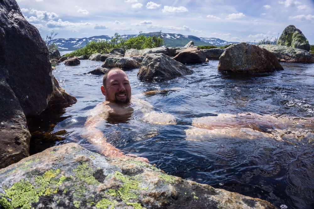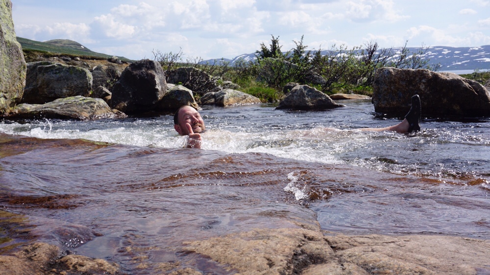 Das Wasser ist so angenehm kühl und ich liege so gut in der Zeit das ich den Rucksack runter lasse, die Badehose anziehe (ja ich habe eine Badehose dabei!) und beschliesse ein Bad zu nehmen. Ich liege über eine Stunde im Wasser und geniesse es einfach nur bei der Hitze im kühlen Nass zu liegen. Dann ziehe ich mich langsam um und mache mich wieder startklar. Dann läuft Martin ein und ich zeige ihm wo er furten kann. Wir legen die letzten Kilometer zur Mårbu gemeinsam zurück.