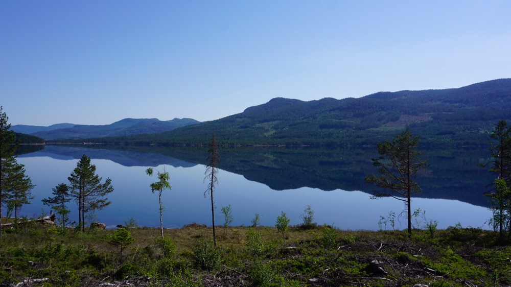 Für mich geht es auf dem Forstweg links um den Skredvatn. Diese spuckt mich nach einigen Kilometern in der Siedlung Åmdals Verk aus und ich laufe eine kleine Nebenstrasse um den Åmlivatn herum in Richtung Dalen.