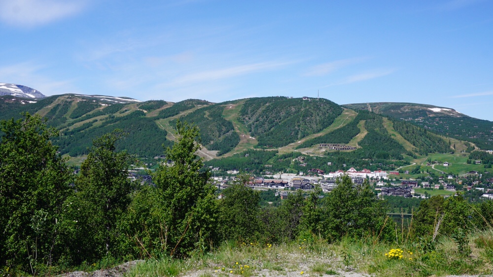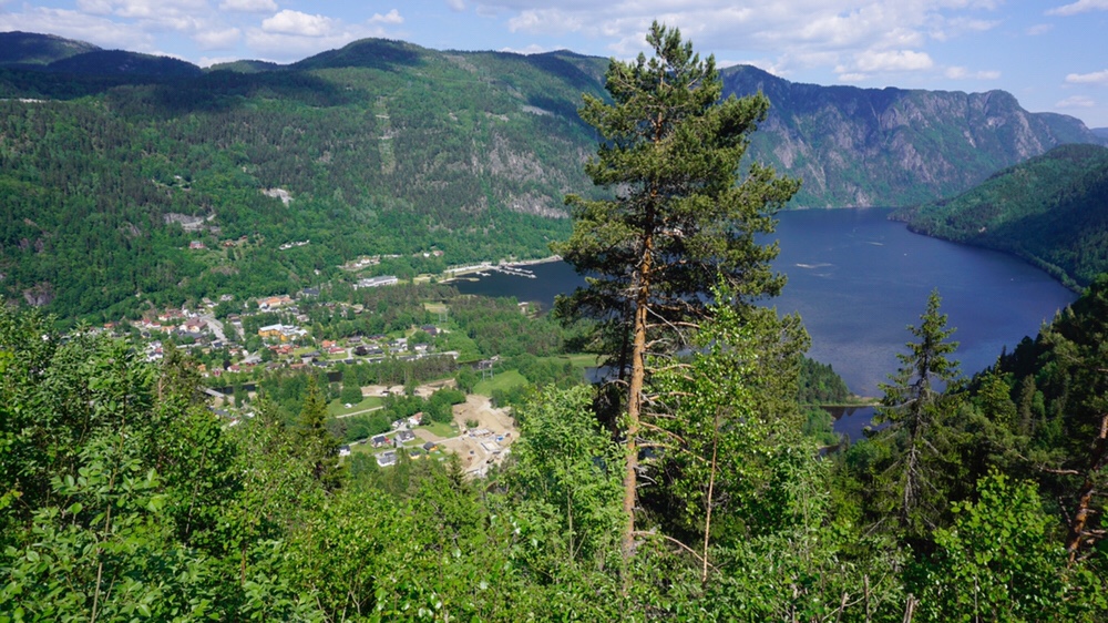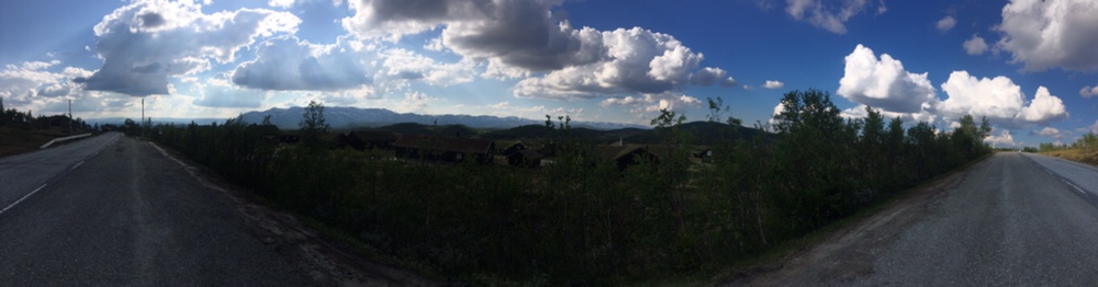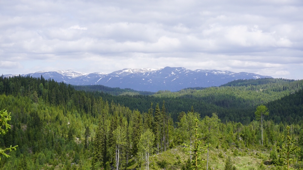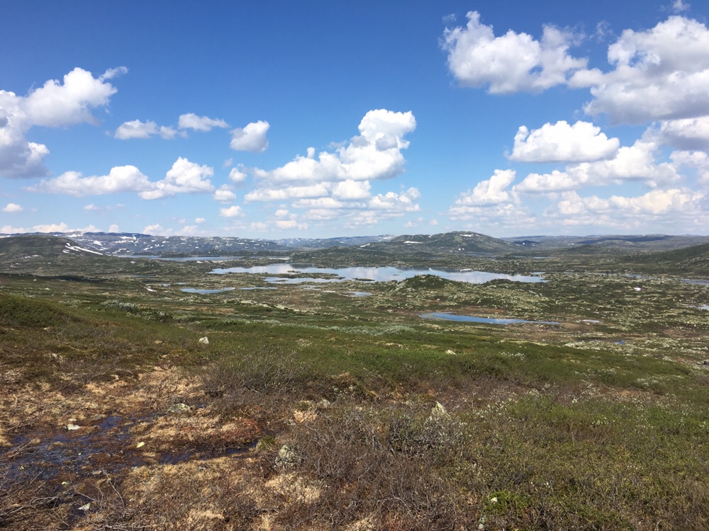 Es geht weiter die Strasse entlang die nun auch merklich anzieht. Immer bergauf komme ich nun am Rauland Skisenter vorbei. Überall sind hier Seilbahnen und Ferienhäuser in den Hang gebaut. Der Anblick ist nicht meins, dafür entschädigte der Ausblick auf die Hardangervidda vor mir und hinter mir der Blick zurück auf die Berge um das Setesdalen herum.