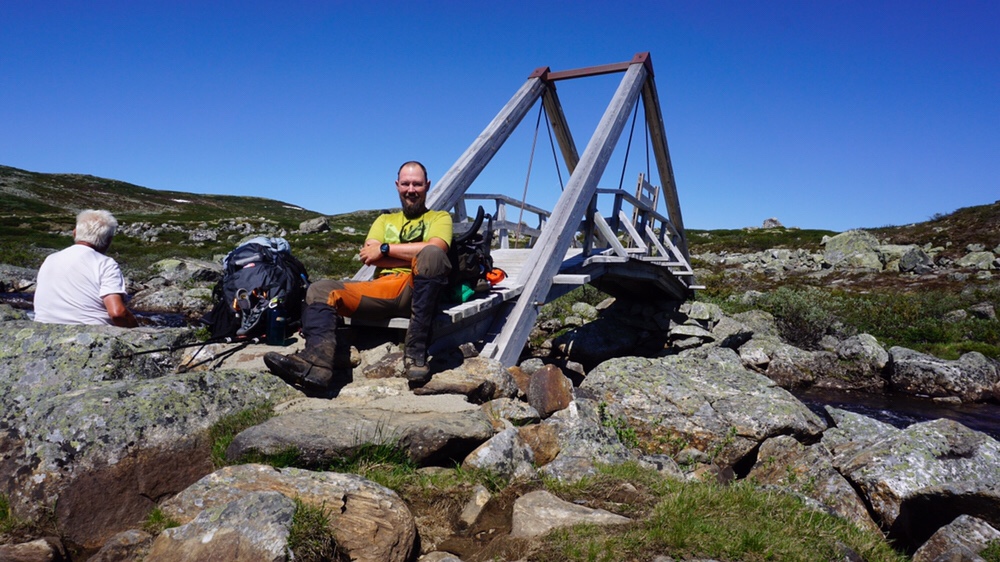 Es wird ein langer und harter Tag. Mit vielen Aufstiegen, Abstiegen und sehr viel Schlamm. Aber auch mit jede Menge Aussicht. Der Hardangerjøkul kommt immer näher und vor uns liegen die Schneebedeckten Berge des Ustedalen. Wir brauchen zwar fast 12 Stunden für die 24 Kilometer nach Tuva und sind dementsprechend fertig, aber die Aussichten haben für die ganzen Anstrengungen entschädigt.