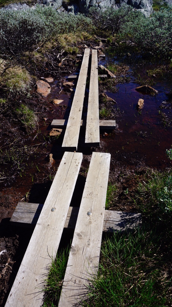 Ich raste kurz und nehme das letzte Stück zur Hütte in Angriff. Der Weg wird nun richtig sumpfig und steigt in Etappen an. Dann passiert eigentlich was passieren muss. An einer extrem schlammigen Stelle will ich diese etwas links umgehen, da das Gras dort tragbar ausschaut. Mit den Stöcken taste ich mich heran und es schaut gut aus. Ich setze mit dem linken Fuss nach und stecke schlagartig bis zum Knie im Morast. Mit dem rechten Bein verusche ich den sinkvorgang zu stoppen stecke aber sofort bis zu Oberschenkel fest. Leichte Panik kommt in mir auf. Aber offenbar geht es nicht weiter runter. Ich versuche die Beine irgendwie frei zu bekommen, höre aber nur ein saug Geräusch und und spüre wie ein Vakuum mich festhält. Es dauert eine ganze Zeit und eine Menge Kraft bis ich mich befreien kann. Der Schreck sitzt noch immer tief als ich langsam weiter bergauf laufe. Ich habe gerade die Schnauze ziemlich voll und trampel nur noch über der Pfad, den Blick stur nach unten gerichtet. Irgendwann komme ich dann an der zweiten Brücke an, von wo der Weg dann nach Rauhelleren geht.