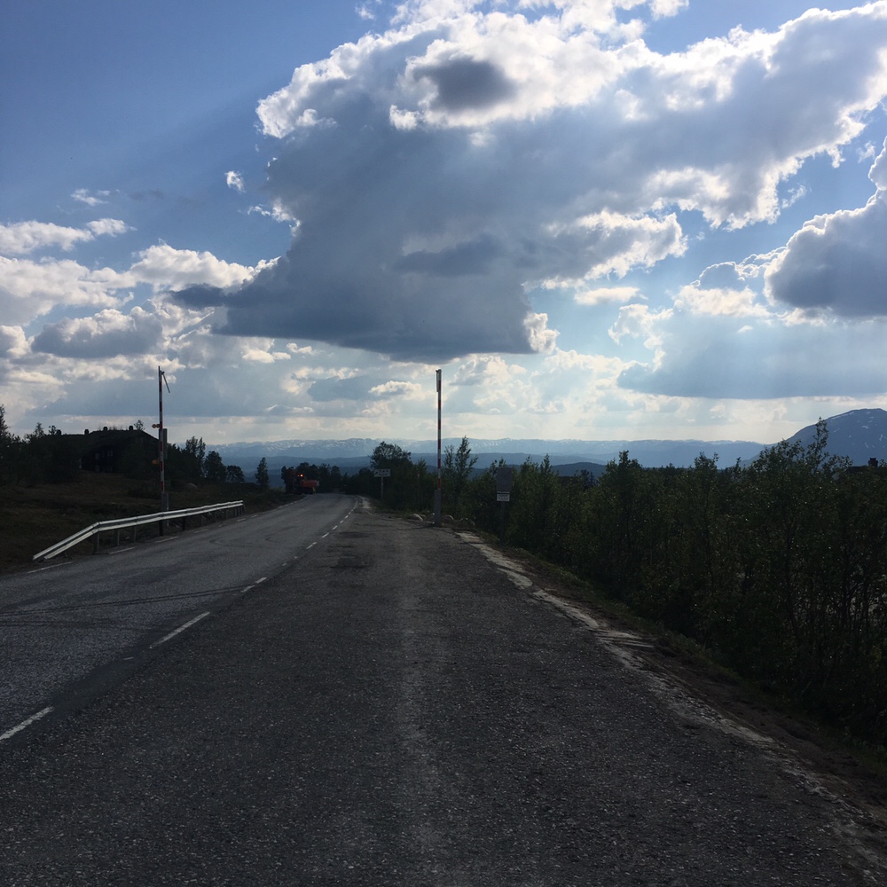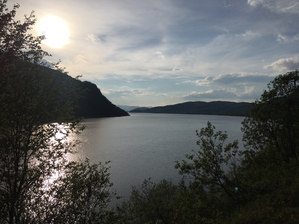 Nach 28km erreiche ich das Vierli Vintercamp. Die Füße machen super mit und so beschließe ich noch ein wenig weiter zu laufen. Irgendwo in die Richtung des Møsvatn denke ich mir. Also weiter Vollgas. Die Strasse geht in einem stetigen auf und ab und irgendwann gegen 19 Uhr finde ich einen Platz der sich als Nachtlager eignen würde. Auf der gegenüberliegenden Strassenseite frage ich eine Frau, deren Hund mich zuvor zu Tode erschreckt hatte ob ich hier mein Zelt aufschlagen dürfe. Für sie ist das kein Problem. Die Rechnung habe ich nicht mit dem Ehegatten gemacht. Der kommt eine gute viertel Stunde später und zeigt mir an, das ich hier nicht bleiben kann. Zum Glück habe ich noch nicht großartig ausgepackt. So Schulter ich unter murren wieder meinen Schwergewichter und laufe weiter in Richtung des Møsvatn. Unterhalb des Sees sehe ich ein paar Kiesbänke wo man vielleicht ein Zelt hinstellen könnte, aber der Abstieg ist mir jetzt gerade zu steil und ich bin nicht gewillt die Böschung abzusteigen.So laufe ich Kilometer um Kilometer entlang des Sees und schaue zu wie langsam die Sonne hinter dem Horizont verschwindet. Zu allem Überfluss schwenkt die Strasse nun nach rechts ab in Sumpfland und die Strasse verwandelt sich in ein einziges Wellblech. Meine Motivation sinkt gerade komplett in den Keller.
