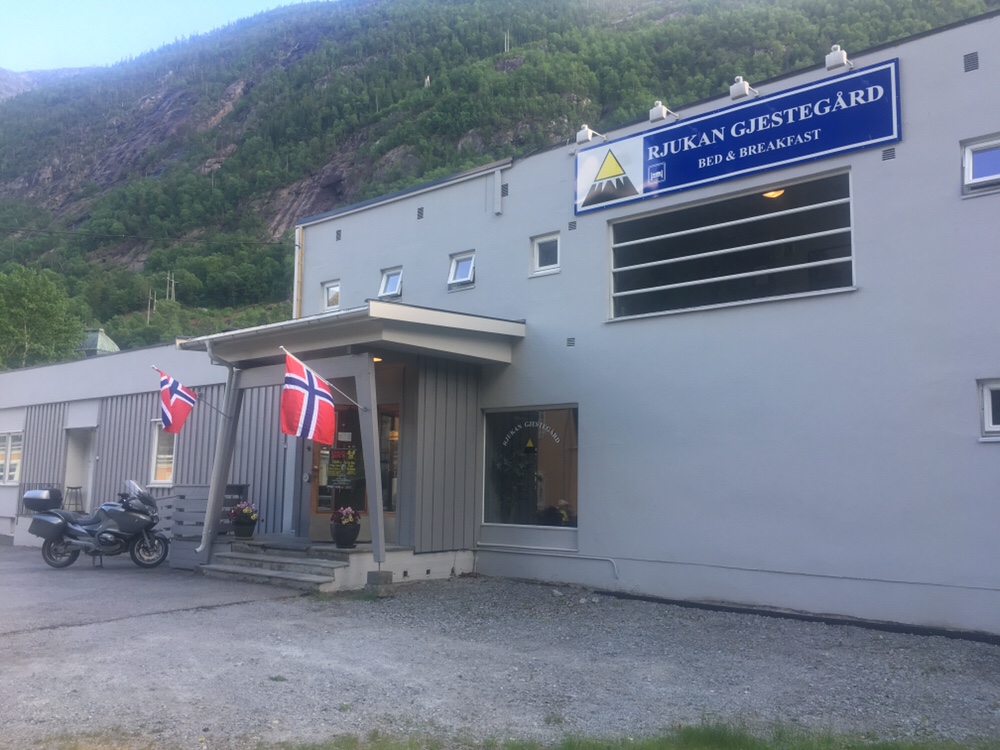 Ich komme am Skinnarbu Nasjonalpark Hotel vorbei, wo die Fähre Fjellvåken II auf dem trockenen liegt. Die Saison für das Boot, das die Route Skinnarbu – Mogen DNT bedient, hat noch nicht begonnen. Meine Stimmung sinkt mit jeden Kilometer mehr in den Keller und kurz vor der Rjukan Fjellstue gabelt mich ein norwegisches Pärchen in einem runter gekommenen Saab Kombi auf. Die beiden Gestalten laden mich mit einem „ich kann doch so spät hier nicht mehr rum laufen“! in ihr Auto ein. Ich sage den beiden das ich noch bis zur Krokan will um dort zu übernachten. Die beiden schauen mich an und fragen ob ich denn nicht wüsste das die Krokan aktuell renoviert und daher geschlossen sei. Na ganz doll denke ich mir! Der Tag wird immer besser. Die beiden nötigen mich regelrecht einzusteigen und mit ihnen nach Rjukan zu kommen und werde auf der Rückbank gleich freundlich euphorisch von der warmen und feuchten Zunge des Vierbeiners dort hinten begrüsst. Das Pärchen ist echt ziemlich strange. Ich könne gerne bei Ihnen Zuhause übernachten wenn ich wolle, aber nur wenn ich kein Cop bin. Ich Runzel kurz die Stirn! Die beiden haben nämlich nicht ganz so legale Substanzen daheim. Ich muss lachen und lehne das Angebot ab. Mir reicht es wenn die beiden mich am Rjukan Gjestegaard absetzen würden. Dort wartet schon Martin auf nicht. Die beiden sind ein wenig perplex und glauben mir wohl erst so richtig wie ich vor Martin stehe und wir uns im Arm liegen. Meiner Mitfahrgelegenheit danke ich für die Fahrt, dann checke ich für zwei Nächte im Gjestegaard ein. 51km an einem Tag reichen mir und ich benötige dringend eine Pause. Das war definitiv zuviel für mich.