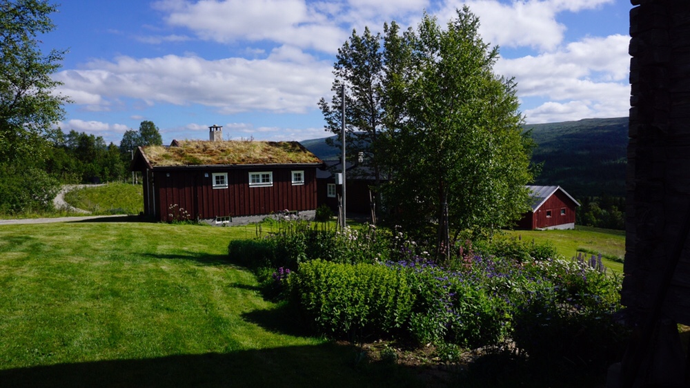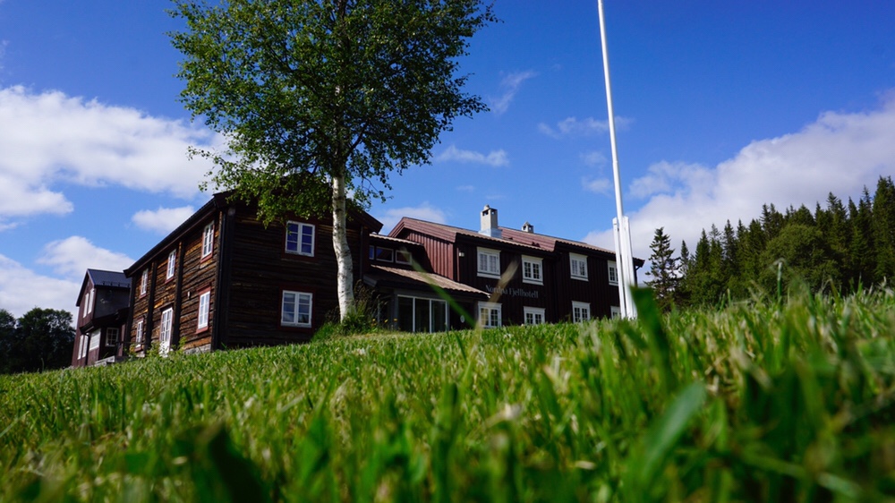 Nach einiger Zeit kann ich an den Hängen die ersten Häuser sehen und ich vermute das dort irgendwo mein Tagesziel liegt. Und so ist es dann auch. Nach einer guten Stunde deutet mir ein Wegweiser das ich nach Links den Weg hinauf soll und nach ein paar hundert Metern stehe ich vor dem Nordpå Fjellhotell.