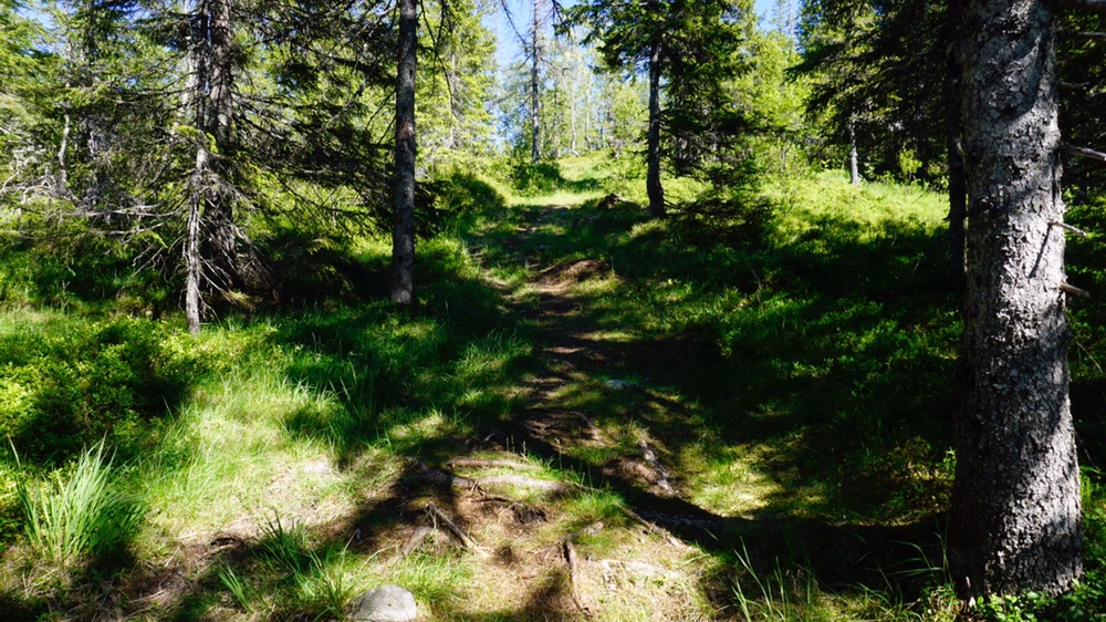 Ich gehe wieder hoch zum Zelt und packe alles zusammen. Dann frühstücke ich und mache mich um neun auf den Weg. Der breite Kiesstreifen hatte sich gestern schon ein paar Kilometer vor dem Rastlatz erledigt und auch jetzt sieht es nicht besser aus. Aber ich habe auf Ut.no eine Alternative gefunden. Etwa 200m hinter dem Rastplatz geht ein Waldweg den Berg hinauf. Dieser führt dann kurz vor Haltdalen wieder hinab ins Tal. Ich beschliesse diesem Weg zu folgen. Und siehe da, der Weg ist sogar richtig schön zu laufen.